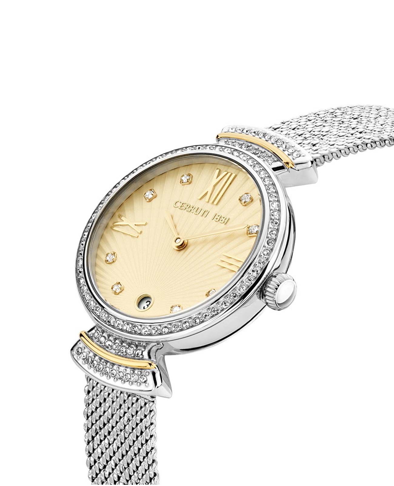 Французские женские часы с кристаллами Cerruti 1881 CERRISI CIWLH2205501, кварцевый механизм с высокой точностью. Минеральное стеклоМинеральное стеклоМинеральное стекло представляет собой искусственно выращенный минерал кварца. Такое стекло отличается особой устойчивостью к повреждениям и царапинам. Уступает по некоторым качествам сапфировому стеклу. устойчивое к мелким механическим повреждениям. Корпус часов изготовлен из стали. БезельБезельВнешний ободок, закрепляющий стекло. В спортивных часах так называется поворотное кольцо с делениями на циферблате, выполняет роль таймера – замеряет отрезки времени на шкале. Неподвижный безель – элемент декора. Однонаправленно вращающийся безель на дайверских часах позволяет фиксировать моменты погружения и выныривания на поверхность. украшен кристаллами. Циферблат украшен кристаллами в виде меток. Окошко даты в положении 6 часов. Класс водозащиты: 50 метров, позволит защитить корпус от случайных брызг или капель дождя. Стальной браслет миланского плетения на застёжке-бабочке с кнопкамиЗастёжка "бабочка"Такой вид застёжки дополняется предохранителями, помогающими избежать случайного раскрытия браслета. Обладают изящным исполнением. .