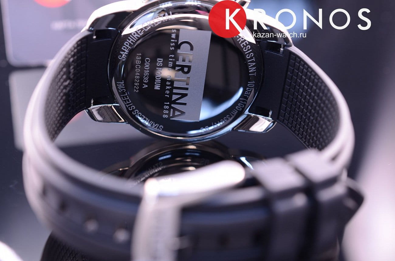 Наручные часы с каучуковым ремешком имеют крупную индикацию времени, на тёмном циферблате расположились счётчики в оригинальном оформлении. Кварцевый хронографХронографФункция позволяет измерять отрезки времени с особой точностью: часы, минуты, секунды. Верным признаком хронографа является наличие на циферблате 3 дополнительных окошек-счётчиков. разработан с реализацией технологии DS Concept DS ConceptDouble Security Concept, обозначает двойную надёжность и безупречную точность часов Certina. Двойная система защиты подразумевает обеспечение максимальной устойчивости к ударам и высоких показателей водонепроницаемости., благодаря чему модель отличается высокой ударопрочностью и водонепроницаемостью до 100 метров. Сапфировое стекло. БезельБезельВнешний ободок, закрепляющий стекло. В спортивных часах так называется поворотное кольцо с делениями на циферблате, выполняет роль таймера – замеряет отрезки времени на шкале. Неподвижный безель – элемент декора. Однонаправленно вращающийся безель на дайверских часах позволяет фиксировать моменты погружения и выныривания на поверхность. c PVD-покрытиемPVDУльтратонкое покрытие наносится в технике вакуумного напыления, сочетает в себе нитрид титана особой прочности со слоем золота или оксида хрома. Несёт в себе декоративную или защитную функцию.. Яркая люминесцентная подсветкаЛюминесцентное покрытиеПозволяет считывать показания времени в темноте. Производители наносят на стрелки, часовые индексы, безель или поверхность циферблата светонакопительный состав, дающий холодное свечение.. Секундомер, отображение даты, функция GMTGMTОтображение времени второго часового пояса.Такая функция особенно актуальна для путешественников и бизнесменов,которые общаются с людьми из разных стран,теперь вы всегда будете знать,какой час у вашего партнёра или близкого человека.. Диаметр корпуса: 42 мм.