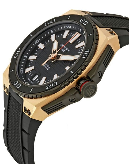 Аксессуар в спортивном стиле оснащён швейцарским кварцевым калибром ETA F07.411 Precidrive™Precidrive™Инновационный кварцевый механизм Certina. Часы, оснащённые этим швейцарским калибром, приравниваются к точности к сертифицированным хронометрам, точность хода составляет +/-10 секунд в год.. Часы основаны на концепции Двойной Надёжности DS ConceptDS ConceptDouble Security Concept, обозначает двойную надёжность и безупречную точность часов Certina. Двойная система защиты подразумевает обеспечение максимальной устойчивости к ударам и высоких показателей водонепроницаемости.. Стальной корпус защищён PVD-покрытиемPVDУльтратонкое покрытие наносится в технике вакуумного напыления, сочетает в себе нитрид титана особой прочности со слоем золота или оксида хрома. Несёт в себе декоративную или защитную функцию. золотистого цвета. Ремешок сделан из прочного, надёжного каучука.