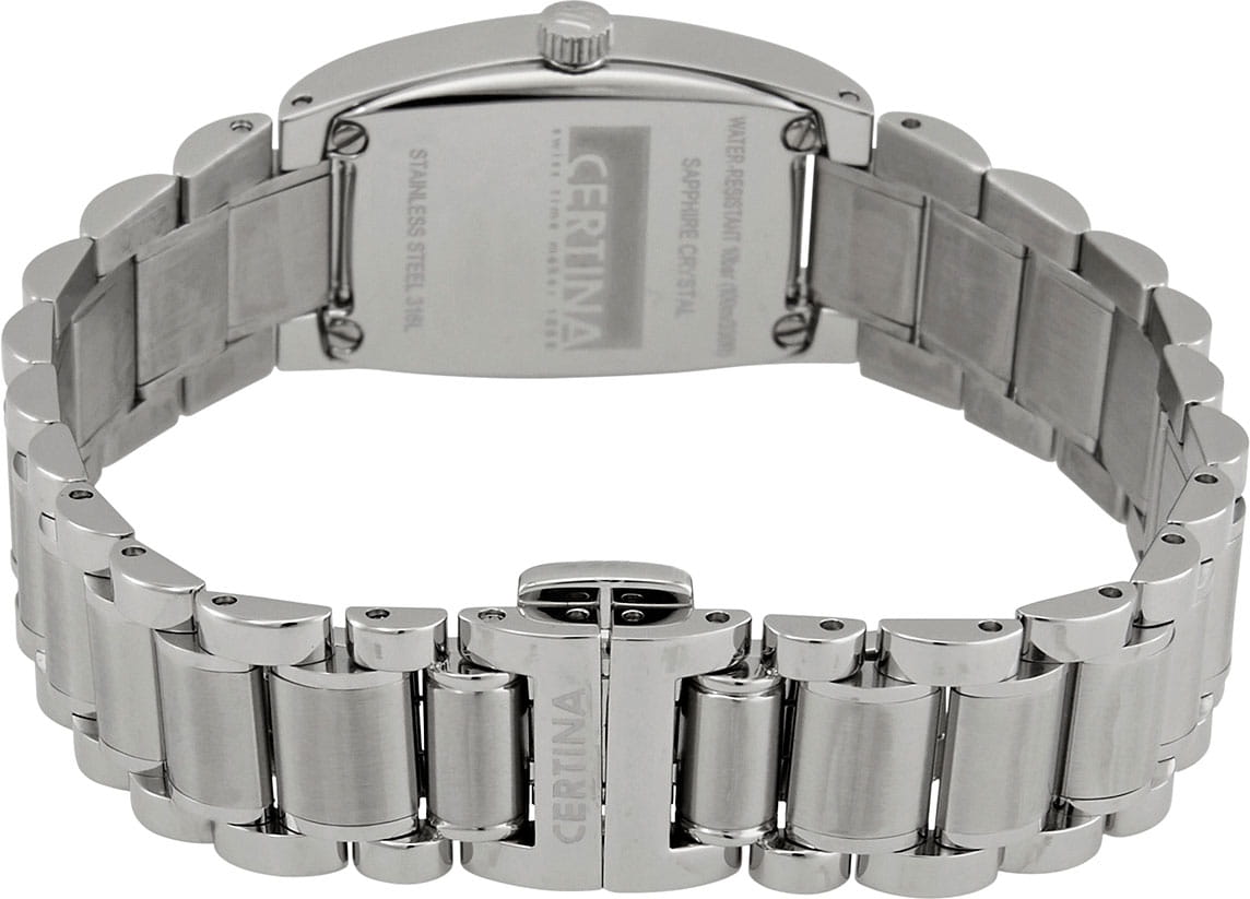 Женские швейцарские часы Certina DS Podium C012.109.11.051.00, кварцевый механизм с высокой точностью. Циферблат защищен сапфировым стекломСапфировое стеклоПрочный и надёжный материал из кристалла сапфира синтетического происхождения, характеризующийся особой твёрдостью и устойчивостью к царапинам и повреждениям., устойчивым к появлению царапин и обладающим высокой прозрачностью. Класс водозащиты: 100 метров, позволит плавать, нырять и заниматься другими водными видами спорта. Корпус часов изготовлен из стали. Застёжка бабочка с кнопкамиЗастёжка "бабочка"Такой вид застёжки дополняется предохранителями, помогающими избежать случайного раскрытия браслета. Обладают изящным исполнением.