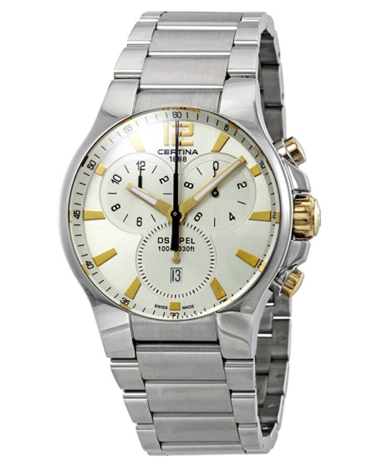 Мужские швейцарские часы- хронографХронографФункция позволяет измерять отрезки времени с особой точностью: часы, минуты, секунды. Верным признаком хронографа является наличие на циферблате 3 дополнительных окошек-счётчиков. Certina DS Spel C0124172103700, кварцевый механизм с высокой точностью. Сапфировое стеклоСапфировое стеклоПрочный и надёжный материал из кристалла сапфира синтетического происхождения, характеризующийся особой твёрдостью и устойчивостью к царапинам и повреждениям. устойчивое к появлению царапин, обладающее высокой прозрачностью. Корпус изготовлен из нержавеющей стали. Стрелки с люминесцентным покрытиемЛюминесцентное покрытиеПозволяет считывать показания времени в темноте. Производители наносят на стрелки, часовые индексы, безель или поверхность циферблата светонакопительный состав, дающий холодное свечение.. Окошко даты находится в положении 6 часов. Класс водозащиты: 100 метров, позволит плавать, нырять и заниматься другими водными видами спорта. Стальной браслет на застёжке-бабочке с кнопкамиЗастёжка "бабочка"Такой вид застёжки дополняется предохранителями, помогающими избежать случайного раскрытия браслета. Обладают изящным исполнением. .