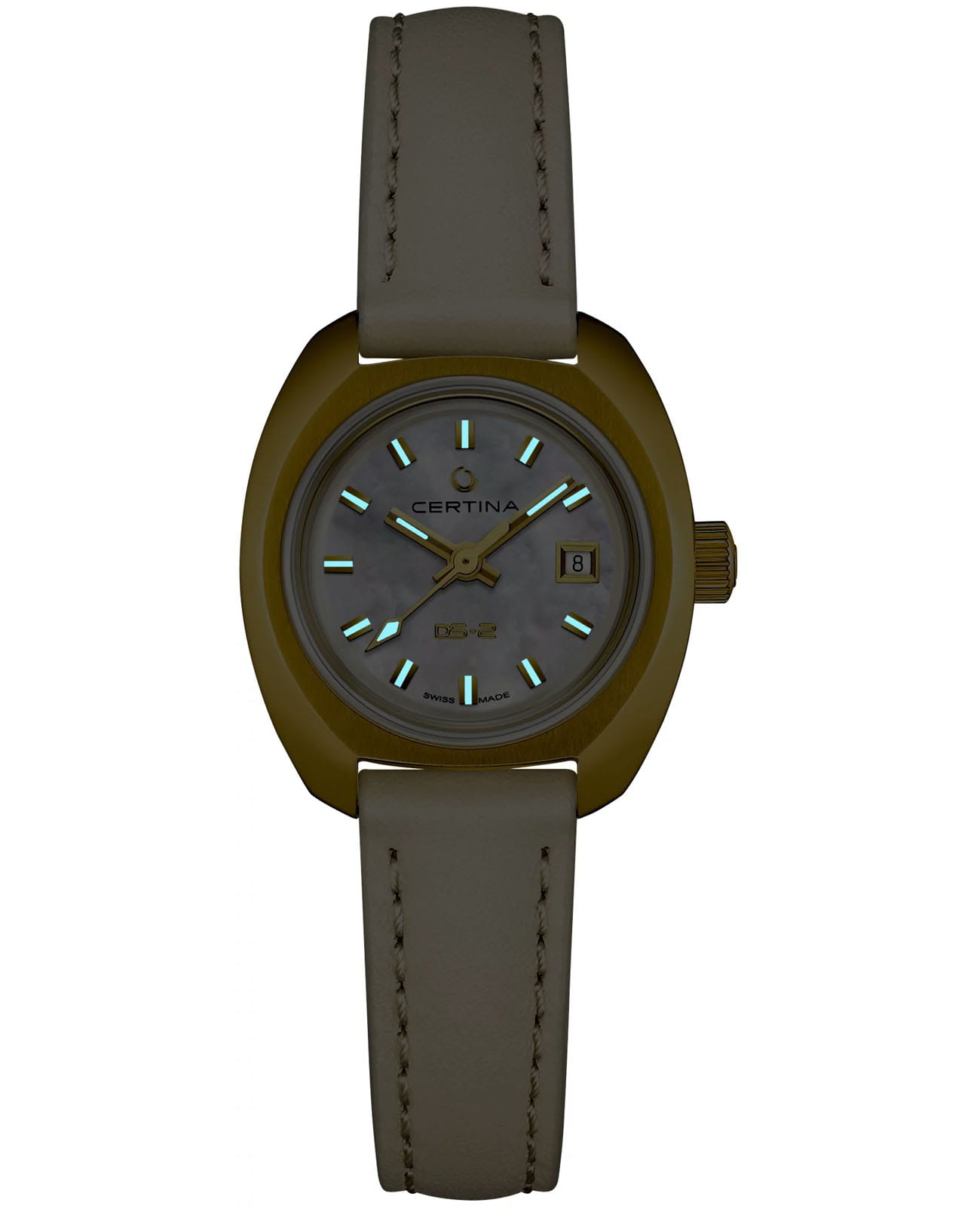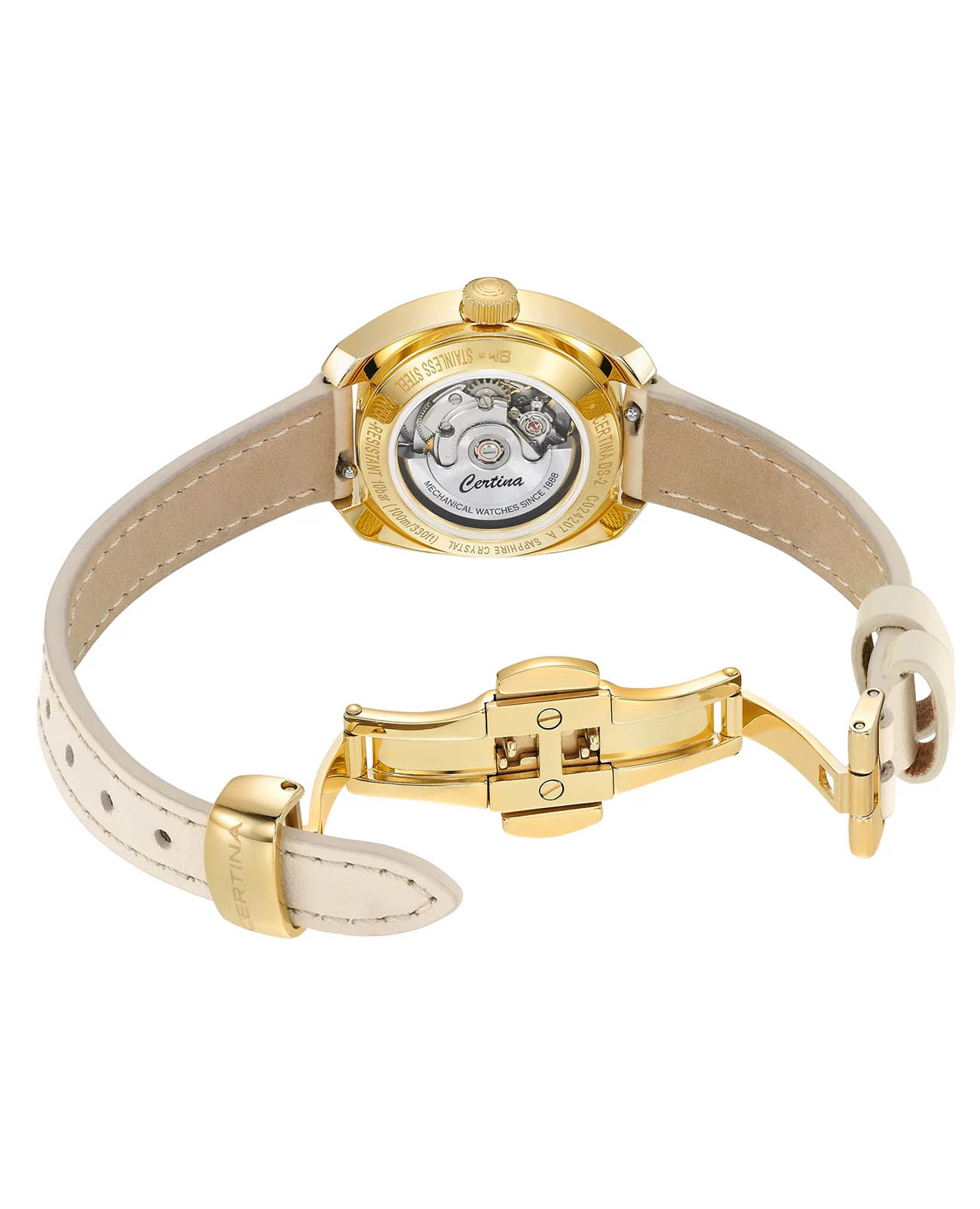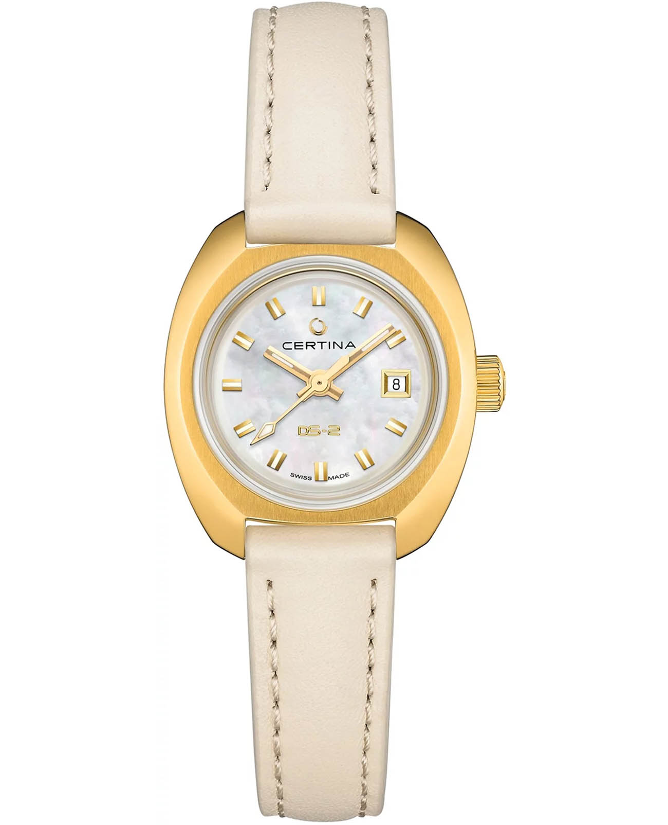 Женские швейцарские механические часы с автоподзаводом Certina DS-2 C0242073611100. Сапфировое стеклоСапфировое стеклоПрочный и надёжный материал из кристалла сапфира синтетического происхождения, характеризующийся особой твёрдостью и устойчивостью к царапинам и повреждениям. устойчивое к появлению царапин, обладающее высокой прозрачностью. Корпус изготовлен из нержавеющей стали с PVD-покрытиемPVDУльтратонкое покрытие наносится в технике вакуумного напыления, сочетает в себе нитрид титана особой прочности со слоем золота или оксида хрома. Несёт в себе декоративную или защитную функцию.. Стрелки с люминесцентным покрытиемЛюминесцентное покрытиеПозволяет считывать показания времени в темноте. Производители наносят на стрелки, часовые индексы, безель или поверхность циферблата светонакопительный состав, дающий холодное свечение. Superluminova. Окошко даты находится в положении 3 часа. Класс водозащиты: 100 метров, позволит плавать, нырять и заниматься другими водными видами спорта. Кожаный ремешок на застёжке-бабочке с кнопкамиЗастёжка "бабочка"Такой вид застёжки дополняется предохранителями, помогающими избежать случайного раскрытия браслета. Обладают изящным исполнением. .