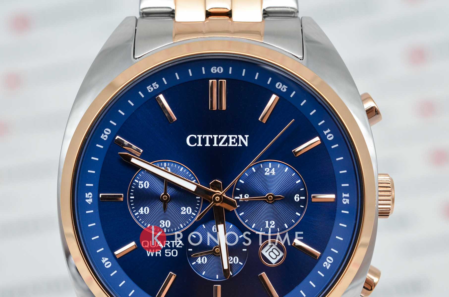 Citizen Chronograph AN8216-50L часы-хронографХронографФункция позволяет измерять отрезки времени с особой точностью: часы, минуты, секунды. Верным признаком хронографа является наличие на циферблате 3 дополнительных окошек-счётчиков. с секундомеромСекундомерСекундоме́р — прибор, способный измерять интервалы времени с точностью до долей секунды.. Корпус из нержавеющей стали диаметром 42 мм идеально сбалансирован. Минеральное стеклоМинеральное стеклоМинеральное стекло представляет собой искусственно выращенный минерал кварца. Такое стекло отличается особой устойчивостью к повреждениям и царапинам. Уступает по некоторым качествам сапфировому стеклу. обеспечивает отличную защиту циферблата от царапин. Часы работают на основе кварцевого механизма. Стальной браслет на раскладной застёжкеРаскладная застёжкаТакой тип застёжки используется только на браслетах из металла. Она никогда не раскрывается полностью, происходит разделение на 2 и более частей. Раскладывающая застёжка снизит вероятность потери часов к минимуму. идеально дополняют дизайн часов, обеспечивая комфортное ношение. БезельБезельВнешний ободок, закрепляющий стекло. В спортивных часах так называется поворотное кольцо с делениями на циферблате, выполняет роль таймера – замеряет отрезки времени на шкале. Неподвижный безель – элемент декора. Однонаправленно вращающийся безель на дайверских часах позволяет фиксировать моменты погружения и выныривания на поверхность. с IP-покрытиемIP-покрытиеМетод ионного напыления. Демонстрирует повышенную устойчивость к истиранию, окислению и химическим веществам. Под воздействием высокого давления и температуры около 1500°C молекулы металла надёжно соединяются с частицами корпуса часов.. Секундомер с точностью показаний 1c и временем измерения 60мин. Окошко даты находится между часовыми отметками 4 и 5. 12-ти и 24-х часовой формат времени отображается на отдельном циферблате. Циферблат с метками в виде штрихов выполнен по технологии Sunray (солнечные лучи). Заводная головка с защитой. Часы обладают водонепроницаемостью до 50WR, что делает их идеальными для повседневной носки.