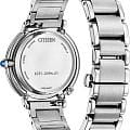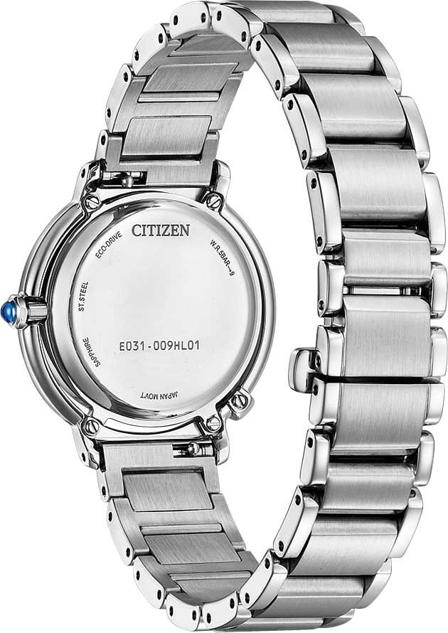 Часы Citizen EM1090-78X – это элегантная модель, созданная в Японии и сочетающая в себе современные технологии и изысканный дизайн. Надежный кварцевый механизм Citizen E031 с инновационной системой Eco-Drive работает от солнечной энергии и не требует замены батарейки, обеспечивая запас хода до 180 дней. Корпус часов выполнен из нержавеющей стали и украшен тремя кристаллами, что придает аксессуару особое сияние. Перламутровый бордовый циферблат с лаконичными метками защищен выпуклым сапфировым стекломСапфировое стеклоПрочный и надёжный материал из кристалла сапфира синтетического происхождения, характеризующийся особой твёрдостью и устойчивостью к царапинам и повреждениям., устойчивым к царапинам. Заводная головка декорирована камнем в форме кабошона, а задняя крышка закреплена на четырех винтах. Стальной браслет оснащен застежкой «бабочка»Застёжка "бабочка"Такой вид застёжки дополняется предохранителями, помогающими избежать случайного раскрытия браслета. Обладают изящным исполнением. и системой быстрой замены, что позволяет легко менять стиль часов в зависимости от вашего настроения. В комплекте также идет сменный бордовый ремешок с такой же застежкой. Водозащита 50WR позволяет не беспокоиться о случайном контакте с водой. Компактные размеры корпуса (диаметр 31,2 мм, толщина 7,8 мм, вес 71 г) обеспечивают комфортное ношение каждый день. Эти часы станут великолепным дополнением к любому образу и подчеркнут вашу индивидуальность.