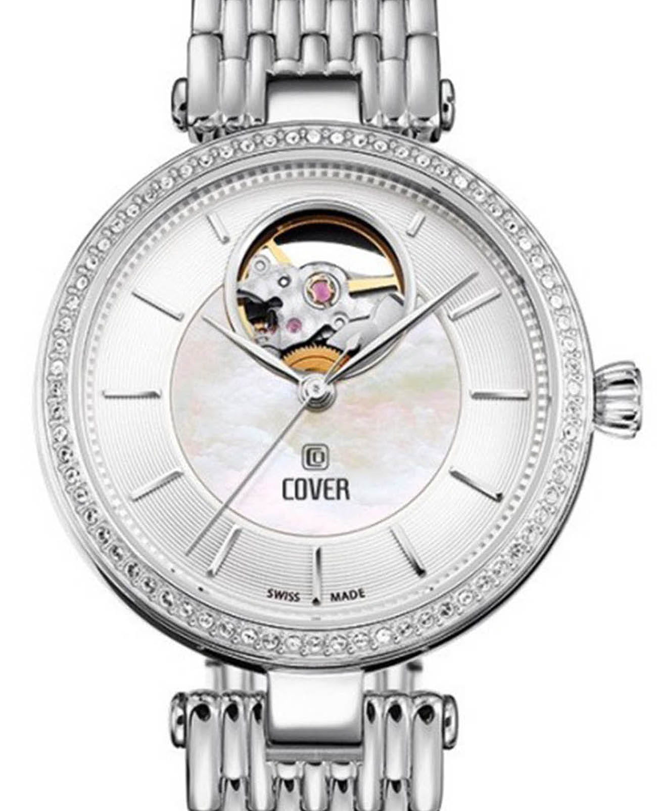 Часы COVER COA9.01 из коллекции Concerta Open Heart – элегантная модель швейцарского производства. Корпус и браслет выполнены из нержавеющей стали серебристого цвета. Центральная область циферблата – белый перламутр, периферийная – круговое гильоше. Тонкий безельБезельВнешний ободок, закрепляющий стекло. В спортивных часах так называется поворотное кольцо с делениями на циферблате, выполняет роль таймера – замеряет отрезки времени на шкале. Неподвижный безель – элемент декора. Однонаправленно вращающийся безель на дайверских часах позволяет фиксировать моменты погружения и выныривания на поверхность. инкрустированный кристаллами Swarovski подчеркивает изысканный стиль. Сапфировое стеклоСапфировое стеклоПрочный и надёжный материал из кристалла сапфира синтетического происхождения, характеризующийся особой твёрдостью и устойчивостью к царапинам и повреждениям. защищает поверхность от повреждений.  Водозащита 100 метров делает часы практичными для повседневного использования. Диаметр корпуса – 35 мм. Застёжка бабочкаЗастёжка "бабочка"Такой вид застёжки дополняется предохранителями, помогающими избежать случайного раскрытия браслета. Обладают изящным исполнением. обеспечивает надежную фиксацию и удобство в носке.