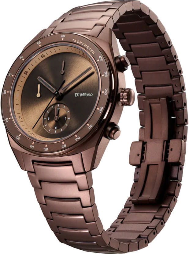 Элегантный хронограф D1 Milano Cronografo Essential Brown CHBJ22 - идеальное воплощение мужественности и стиля. Этот многофункциональный аксессуар оснащен секундомером, тахиметромТахиметрРазмеченная шкала, располагается на ободке или безеле часов. Тахиметр позволяет рассчитать скорость на определённом участке пути, расстояние измеряется в километрах или милях.. что делает его незаменимым компаньоном в повседневной жизни. Изысканный корпус и браслет выполнены из стали с PVD-покрытиемPVDУльтратонкое покрытие наносится в технике вакуумного напыления, сочетает в себе нитрид титана особой прочности со слоем золота или оксида хрома. Несёт в себе декоративную или защитную функцию.. Минималистичный дизайн циферблата, защищенный прочным сапфировым стекломСапфировое стеклоПрочный и надёжный материал из кристалла сапфира синтетического происхождения, характеризующийся особой твёрдостью и устойчивостью к царапинам и повреждениям. с антибликовым покрытиемАнтибликовое покрытиеСлой оксида металла в 0,13-0,3 микрон, благодаря которому стекло часов не бликует и не отражает свет. Антибликовое покрытие уменьшает отражение света в 10 раз, обеспечивая отличную читаемость показателей циферблата., привлекает внимание своей сдержанной красотой. Стрелки с люминесцентным покрытиемЛюминесцентное покрытиеПозволяет считывать показания времени в темноте. Производители наносят на стрелки, часовые индексы, безель или поверхность циферблата светонакопительный состав, дающий холодное свечение., обеспечивающим хорошую читаемость в темноте. Надежная конструкция с задней крышкой на 8 винтах и стильный браслет с удобной застёжкой «бабочка» с кнопкамиЗастёжка "бабочка"Такой вид застёжки дополняется предохранителями, помогающими избежать случайного раскрытия браслета. Обладают изящным исполнением. обеспечивают комфорт при ношении. Водозащита 50 метров защищает часы от брызг и дождя, делая их подходящими для повседневного использования. Это не просто часы, а статусный аксессуар, подчеркивающий безупречный вкус и внимание к деталям своего владельца.