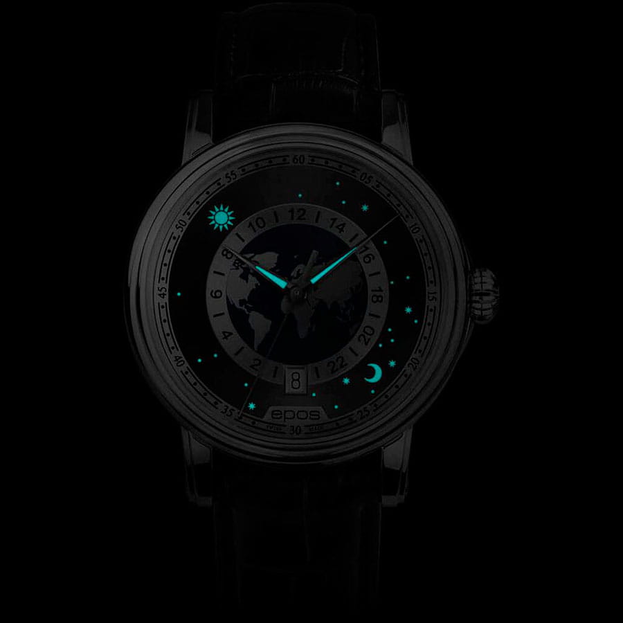 Мужские швейцарские механические часы с автоподзаводом Epos Passion 3390.302.20.54.25. Сапфировое стеклоСапфировое стеклоПрочный и надёжный материал из кристалла сапфира синтетического происхождения, характеризующийся особой твёрдостью и устойчивостью к царапинам и повреждениям. устойчивое к появлению царапин, обладающее высокой прозрачностью. Корпус часов изготовлен из нержавеющей стали. Индикация даты. 24х часовой формат времени. Стрелки и метки с люминесцентной подсветкойЛюминесцентное покрытиеПозволяет считывать показания времени в темноте. Производители наносят на стрелки, часовые индексы, безель или поверхность циферблата светонакопительный состав, дающий холодное свечение.. Окошко даты находится в положении 6 часов. Прозрачная задняя крышка. Класс водозащиты: 50 метров, позволит защитить корпус от случайных брызг или капель дождя. Кожаный ремешок на стандартной застёжке. Ширина ремешка 20 мм.