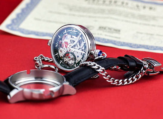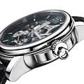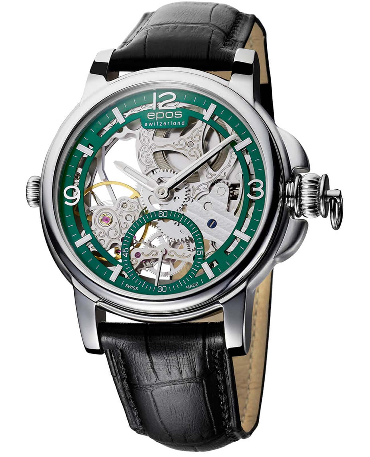 Мужские механические часы с ручным подзаводом Epos из коллекции Oeuvre d'art — это настоящее произведение часового искусства. Корпус диаметром 45 мм и толщиной 13 мм выполнен из нержавеющей стали 316L. Циферблат изумрудно-зелёного цвета частично скелетонизирован, с открытой центральной частью, что позволяет наблюдать за работой механизма. Циферблат защищён сапфировым стекломСапфировое стеклоПрочный и надёжный материал из кристалла сапфира синтетического происхождения, характеризующийся особой твёрдостью и устойчивостью к царапинам и повреждениям.. Малая секундная стрелка вынесена на отдельный циферблат. Механизм — швейцарский калибр ETA Unitas 6498 с ручным подзаводом, модифицированный и декорированный вручную: мосты скелетонизированы, украшены гравировкой и жемчужным зернением. Прозрачная задняя крышка позволяет наблюдать за работой механизма. Заводная головка — винтовая, формы «луковица». Часы оснащены кожаным ремешком чёрного цвета с тиснением под аллигатора и застёжкой «бабочка» с кнопкамиЗастёжка "бабочка"Такой вид застёжки дополняется предохранителями, помогающими избежать случайного раскрытия браслета. Обладают изящным исполнением. . Модель выпущена ограниченной серией — 2015 экземпляров. Водонепроницаемость 50 м позволяет использовать часы в повседневных условиях. Гарантия — 24 месяца. Уникальный выбор для ценителя ручного мастерства и эксклюзивного дизайна.