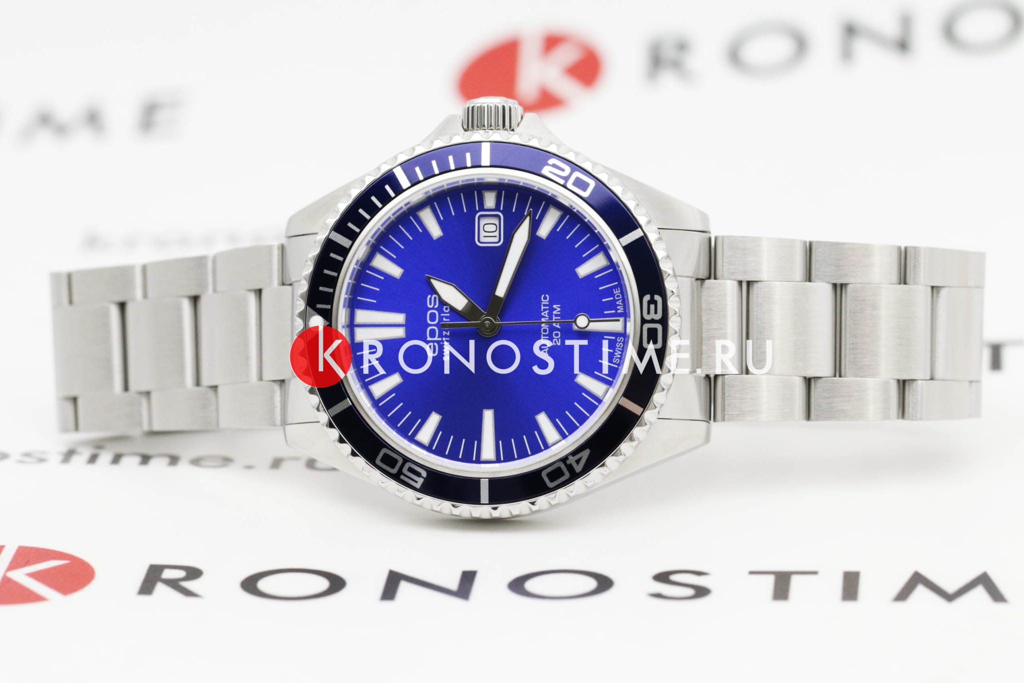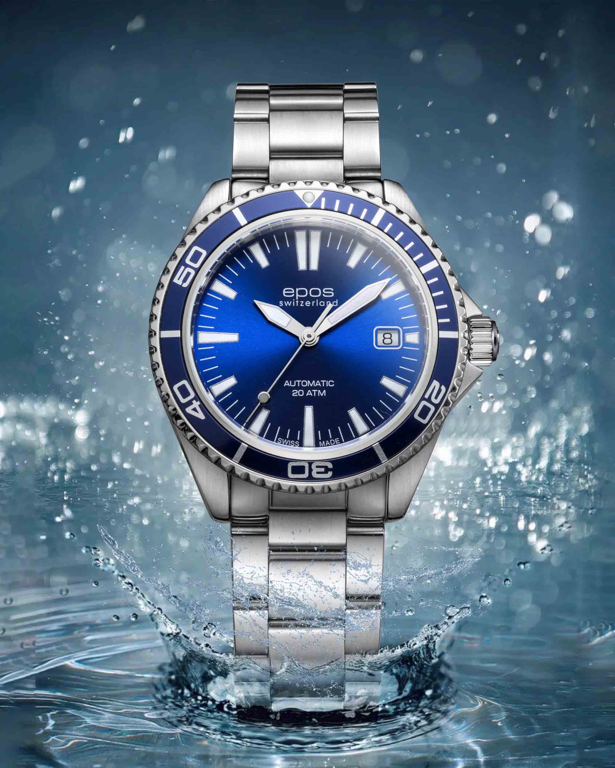 Мужские механические часы с автоподзаводом Epos из коллекции Diver — это надёжный инструмент для активного образа жизни. Корпус диаметром 41 мм и толщиной 12 мм выполнен из нержавеющей стали 316L. Циферблат синего цвета оформлен с матовой поверхностью, с печатными индексами и стрелками с покрытием цвета родия. Циферблат защищён сапфировым стекломСапфировое стеклоПрочный и надёжный материал из кристалла сапфира синтетического происхождения, характеризующийся особой твёрдостью и устойчивостью к царапинам и повреждениям.. Стрелки и метки с люминесцентным покрытиемЛюминесцентное покрытиеПозволяет считывать показания времени в темноте. Производители наносят на стрелки, часовые индексы, безель или поверхность циферблата светонакопительный состав, дающий холодное свечение. Super-Luminova, обеспечивающим отличную читаемость в темноте. Механизм — швейцарский калибр ETA 2824. Окошко даты расположено в положении 3 часов. БезельБезельВнешний ободок, закрепляющий стекло. В спортивных часах так называется поворотное кольцо с делениями на циферблате, выполняет роль таймера – замеряет отрезки времени на шкале. Неподвижный безель – элемент декора. Однонаправленно вращающийся безель на дайверских часах позволяет фиксировать моменты погружения и выныривания на поверхность. — однонаправленный вращающийся, с PVD-покрытиемPVDУльтратонкое покрытие наносится в технике вакуумного напыления, сочетает в себе нитрид титана особой прочности со слоем золота или оксида хрома. Несёт в себе декоративную или защитную функцию.. и шкалой погружений, что делает часы пригодными для дайвинга. Завинчивающаяся коронка и задняя крышка обеспечивают повышенную защиту. Часы оснащены стальным браслетом с литыми звеньями в 3 ряда и раскладной застёжкойРаскладная застёжкаТакой тип застёжки используется только на браслетах из металла. Она никогда не раскрывается полностью, происходит разделение на 2 и более частей. Раскладывающая застёжка снизит вероятность потери часов к минимуму. с дополнительным фиксатором. Водонепроницаемость 200 м позволяет использовать часы для глубоководных погружений. Гарантия — 24 месяца. Идеальный выбор для тех, кто ценит точность, прочность и функциональность.