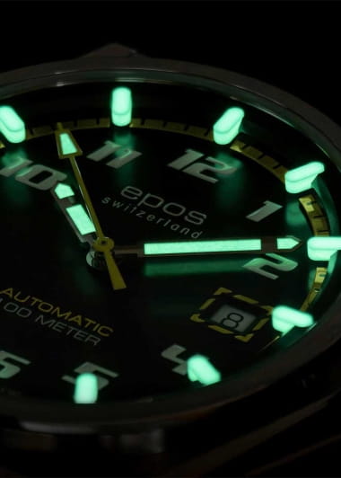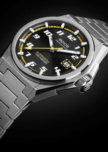 Мужские механические часы с автоподзаводом Epos из коллекции Sportive — это стильный и надёжный аксессуар с швейцарским качеством. Корпус диаметром 41 мм и толщиной 11 мм выполнен из нержавеющей стали 316L. Циферблат чёрного цвета оформлен по технологии «солнечные лучи» (Sunray) и дополнен метками в виде штрихов и арабских цифр. Циферблат защищён сапфировым стекломСапфировое стеклоПрочный и надёжный материал из кристалла сапфира синтетического происхождения, характеризующийся особой твёрдостью и устойчивостью к царапинам и повреждениям.. Стрелки и объёмные метки с люминесцентным покрытиемЛюминесцентное покрытиеПозволяет считывать показания времени в темноте. Производители наносят на стрелки, часовые индексы, безель или поверхность циферблата светонакопительный состав, дающий холодное свечение., обеспечивающим отличную читаемость в темноте. Механизм — швейцарский калибр Sellita SW200 с запасом хода 38 часов. Окошко даты расположено в положении 3 часов. Завинчивающаяся коронка обеспечивает дополнительную защиту. Прозрачная задняя крышка позволяет наблюдать за работой механизма. Часы оснащены стальным браслетом на раскладной застёжкеРаскладная застёжкаТакой тип застёжки используется только на браслетах из металла. Она никогда не раскрывается полностью, происходит разделение на 2 и более частей. Раскладывающая застёжка снизит вероятность потери часов к минимуму.. Водонепроницаемость 100 м позволяет использовать часы для плавания и повседневного ношения. Гарантия — 24 месяца. Универсальный выбор для ценителя механики и спортивного стиля.