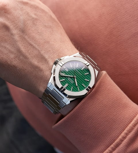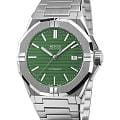 Мужские механические часы с автоподзаводом Epos из коллекции Sportive — это стильный и надёжный аксессуар с швейцарским качеством. Корпус диаметром 41 мм и толщиной 10,7 мм выполнен из нержавеющей стали 316L. Циферблат зелёного цвета оформлен рифлёным узором и метками в виде штрихов. Циферблат защищён сапфировым стекломСапфировое стеклоПрочный и надёжный материал из кристалла сапфира синтетического происхождения, характеризующийся особой твёрдостью и устойчивостью к царапинам и повреждениям.. Стрелки и метки с люминесцентным покрытиемЛюминесцентное покрытиеПозволяет считывать показания времени в темноте. Производители наносят на стрелки, часовые индексы, безель или поверхность циферблата светонакопительный состав, дающий холодное свечение., обеспечивающим хорошую читаемость в темноте. Механизм — швейцарский калибр ETA 2824. Окошко даты расположено в положении 3 часов. Завинчивающаяся коронка обеспечивает дополнительную защиту. Прозрачная задняя крышка позволяет наблюдать за работой декорированного механизма. Часы оснащены стальным браслетом на застёжке «бабочка» с кнопкамиЗастёжка "бабочка"Такой вид застёжки дополняется предохранителями, помогающими избежать случайного раскрытия браслета. Обладают изящным исполнением. . Водонепроницаемость 100 м позволяет использовать часы для плавания и повседневного ношения. Гарантия — 24 месяца. Универсальный выбор для ценителя механики и элегантного спортивного стиля.