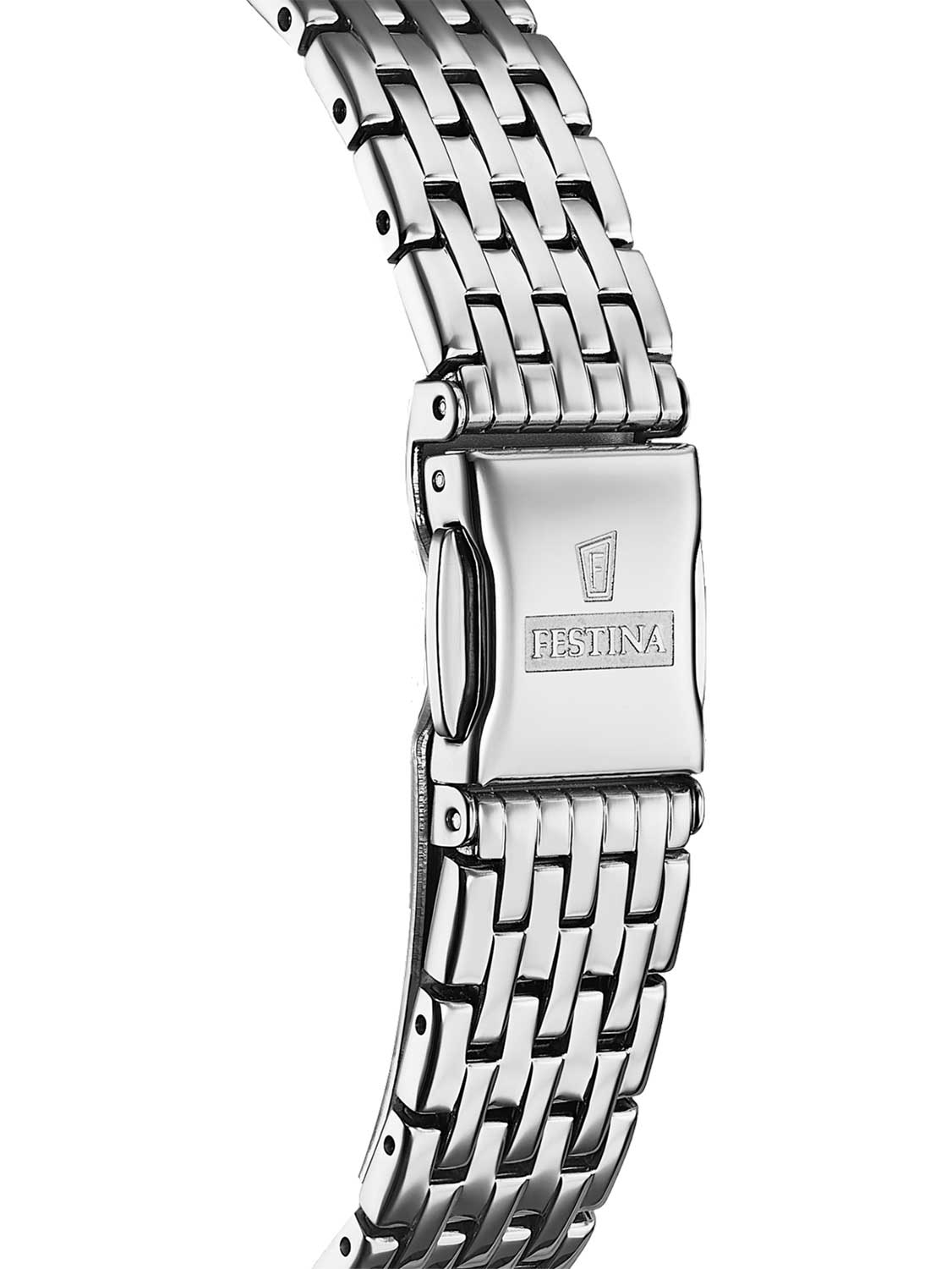 Женские кварцевые часы с окошком даты Festina Swiss Made F20019/3, кварцевый механизм с высокой точностью. Сапфировое стеклоСапфировое стеклоПрочный и надёжный материал из кристалла сапфира синтетического происхождения, характеризующийся особой твёрдостью и устойчивостью к царапинам и повреждениям. устойчивое к появлению царапин, обладающее высокой прозрачностью. Класс водозащиты: 50 метров, позволит защитить корпус от случайных брызг или капель дождя. Корпус часов изготовлен из стали. Стальной браслет на раскладной застёжкеРаскладная застёжкаТакой тип застёжки используется только на браслетах из металла. Она никогда не раскрывается полностью, происходит разделение на 2 и более частей. Раскладывающая застёжка снизит вероятность потери часов к минимуму.. Циферблат выполнен по технологии Sunray (солнечные лучи). Метки в виде штрихов. Две стрелки. Окошко даты.
