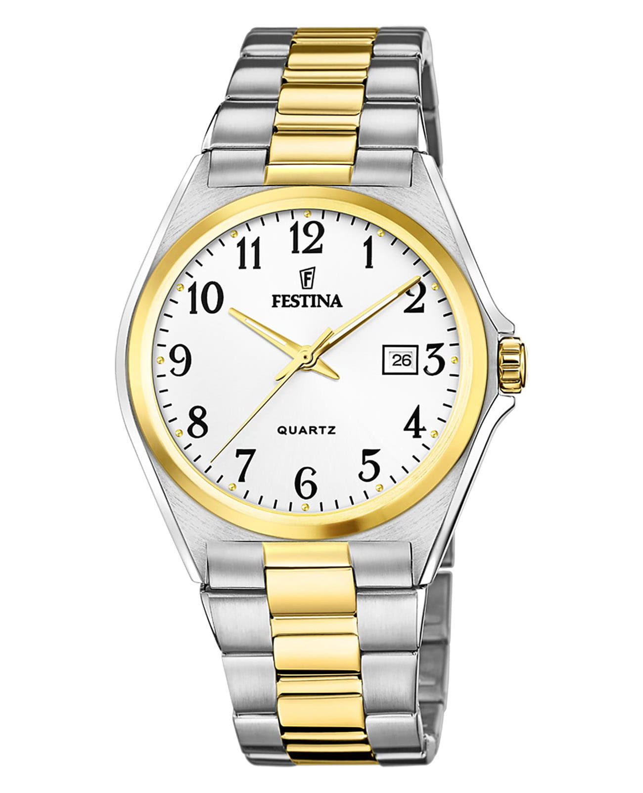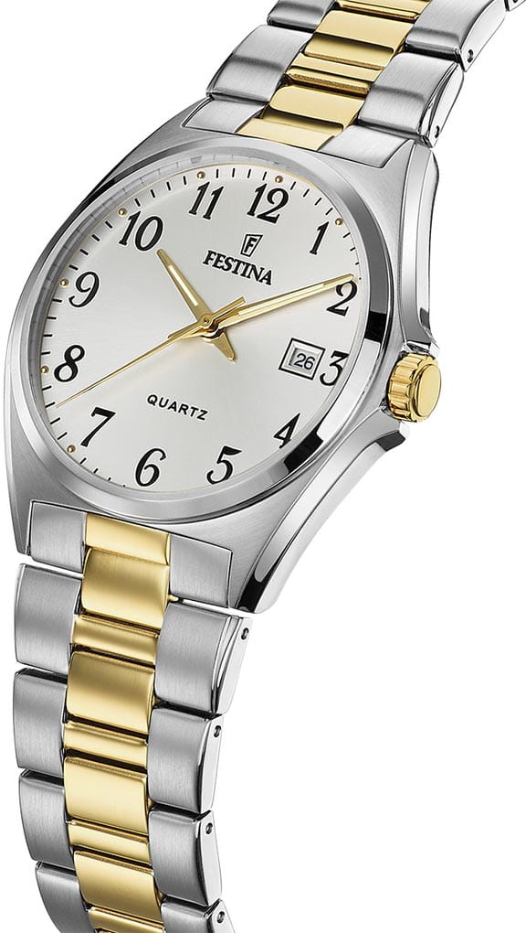 Наручные мужские часы с окошком даты Festina Clasico F20554/1, кварцевый механизм с высокой точностью, минеральное стеклоМинеральное стеклоМинеральное стекло представляет собой искусственно выращенный минерал кварца. Такое стекло отличается особой устойчивостью к повреждениям и царапинам. Уступает по некоторым качествам сапфировому стеклу.. Корпус и браслет часов изготовлены из стали с частичным PVDPVDУльтратонкое покрытие наносится в технике вакуумного напыления, сочетает в себе нитрид титана особой прочности со слоем золота или оксида хрома. Несёт в себе декоративную или защитную функцию. покрытием. Браслет на раскладной застёжкеРаскладная застёжкаТакой тип застёжки используется только на браслетах из металла. Она никогда не раскрывается полностью, происходит разделение на 2 и более частей. Раскладывающая застёжка снизит вероятность потери часов к минимуму.