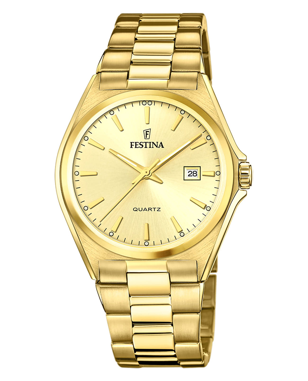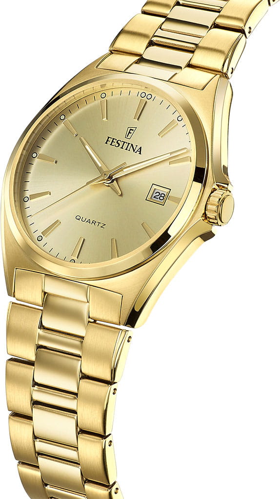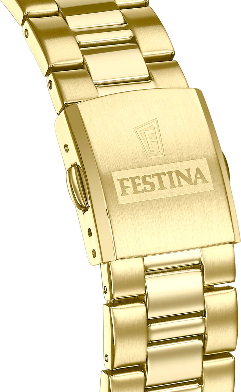 Наручные мужские часы с окошком даты Festina Clasico F20555/3, кварцевый механизм с высокой точностью, минеральное стеклоМинеральное стеклоМинеральное стекло представляет собой искусственно выращенный минерал кварца. Такое стекло отличается особой устойчивостью к повреждениям и царапинам. Уступает по некоторым качествам сапфировому стеклу.. Класс водозащиты: 50 метров, позволит защитить часы от случайных брызг воды. Корпус и браслет часов изготовлены из стали с PVDPVDУльтратонкое покрытие наносится в технике вакуумного напыления, сочетает в себе нитрид титана особой прочности со слоем золота или оксида хрома. Несёт в себе декоративную или защитную функцию. покрытием. Браслет на раскладной застёжкеРаскладная застёжкаТакой тип застёжки используется только на браслетах из металла. Она никогда не раскрывается полностью, происходит разделение на 2 и более частей. Раскладывающая застёжка снизит вероятность потери часов к минимуму.