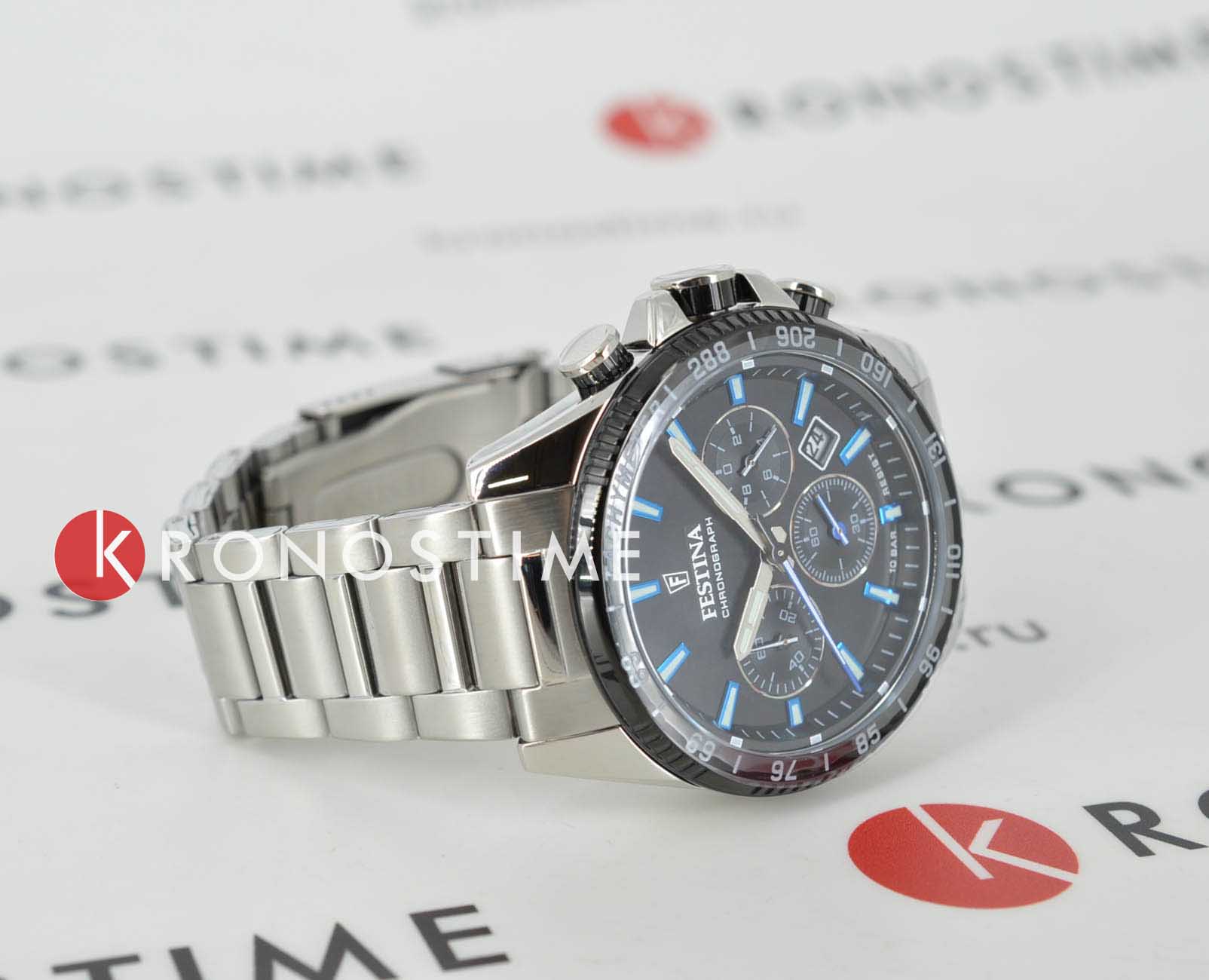 Festina F20560/5 — это эксклюзивный хронографХронографФункция позволяет измерять отрезки времени с особой точностью: часы, минуты, секунды. Верным признаком хронографа является наличие на циферблате 3 дополнительных окошек-счётчиков. с секундомеромСекундомерСекундоме́р — прибор, способный измерять интервалы времени с точностью до долей секунды. и тахиметромТахиметрРазмеченная шкала, располагается на ободке или безеле часов. Тахиметр позволяет рассчитать скорость на определённом участке пути, расстояние измеряется в километрах или милях., который станет отличным выбором для мужчин, ценящих стиль, функциональность и надежность. Часы отличаются продуманным дизайном и качественной отделкой, что делает их идеальными как для повседневной носки, так и для деловых встреч. Минеральное стеклоМинеральное стеклоМинеральное стекло представляет собой искусственно выращенный минерал кварца. Такое стекло отличается особой устойчивостью к повреждениям и царапинам. Уступает по некоторым качествам сапфировому стеклу. защищает циферблат от царапин и обладает высокой прозрачностью. Стрелки покрыты люминесцентным покрытиемЛюминесцентное покрытиеПозволяет считывать показания времени в темноте. Производители наносят на стрелки, часовые индексы, безель или поверхность циферблата светонакопительный состав, дающий холодное свечение., благодаря чему время легко считывается даже в темноте. БезельБезельВнешний ободок, закрепляющий стекло. В спортивных часах так называется поворотное кольцо с делениями на циферблате, выполняет роль таймера – замеряет отрезки времени на шкале. Неподвижный безель – элемент декора. Однонаправленно вращающийся безель на дайверских часах позволяет фиксировать моменты погружения и выныривания на поверхность. с PVDPVDУльтратонкое покрытие наносится в технике вакуумного напыления, сочетает в себе нитрид титана особой прочности со слоем золота или оксида хрома. Несёт в себе декоративную или защитную функцию. покрытием подчеркивает премиальный внешний вид. Водозащита 100 метров защищает от брызг и дождя. Корпус и браслет выполнены из высококачественной стали 316L, а браслет оснащён раскладной застёжкойРаскладная застёжкаТакой тип застёжки используется только на браслетах из металла. Она никогда не раскрывается полностью, происходит разделение на 2 и более частей. Раскладывающая застёжка снизит вероятность потери часов к минимуму. с системой блокировки для максимального комфорта и безопасности.