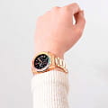Яркий стиль и функциональность этих часов придутся по душе активной девушке. Часы-хронографХронографФункция позволяет измерять отрезки времени с особой точностью: часы, минуты, секунды. Верным признаком хронографа является наличие на циферблате 3 дополнительных окошек-счётчиков.. Кварцевый механизм с высокой точностью. Минеральное стеклоМинеральное стеклоМинеральное стекло представляет собой искусственно выращенный минерал кварца. Такое стекло отличается особой устойчивостью к повреждениям и царапинам. Уступает по некоторым качествам сапфировому стеклу. устойчивое к появлению царапин, обладающее высокой прозрачностью. Циферблат выполнен по технологии Sunray (солнечные лучи). Стрелки и метки с люминесцентным покрытиемЛюминесцентное покрытиеПозволяет считывать показания времени в темноте. Производители наносят на стрелки, часовые индексы, безель или поверхность циферблата светонакопительный состав, дающий холодное свечение.. БезельБезельВнешний ободок, закрепляющий стекло. В спортивных часах так называется поворотное кольцо с делениями на циферблате, выполняет роль таймера – замеряет отрезки времени на шкале. Неподвижный безель – элемент декора. Однонаправленно вращающийся безель на дайверских часах позволяет фиксировать моменты погружения и выныривания на поверхность. с PVD-покрытиемPVDУльтратонкое покрытие наносится в технике вакуумного напыления, сочетает в себе нитрид титана особой прочности со слоем золота или оксида хрома. Несёт в себе декоративную или защитную функцию. украшенный цветными цирконами. Класс водозащиты: 100 метров, позволит плавать, нырять и заниматься другими водными видами спорта. БезельБезельВнешний ободок, закрепляющий стекло. В спортивных часах так называется поворотное кольцо с делениями на циферблате, выполняет роль таймера – замеряет отрезки времени на шкале. Неподвижный безель – элемент декора. Однонаправленно вращающийся безель на дайверских часах позволяет фиксировать моменты погружения и выныривания на поверхность. и корпус часов изготовлены из нержавеющей стали с PVD-покрытиемPVDУльтратонкое покрытие наносится в технике вакуумного напыления, сочетает в себе нитрид титана особой прочности со слоем золота или оксида хрома. Несёт в себе декоративную или защитную функцию.. Браслет с PVD-покрытиемPVDУльтратонкое покрытие наносится в технике вакуумного напыления, сочетает в себе нитрид титана особой прочности со слоем золота или оксида хрома. Несёт в себе декоративную или защитную функцию. и с раскладной застёжкойРаскладная застёжкаТакой тип застёжки используется только на браслетах из металла. Она никогда не раскрывается полностью, происходит разделение на 2 и более частей. Раскладывающая застёжка снизит вероятность потери часов к минимуму..