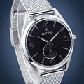 Яркий стиль и функциональность этих часов придутся по душе каждому. циферблат защищен минеральным стекломМинеральное стеклоМинеральное стекло представляет собой искусственно выращенный минерал кварца. Такое стекло отличается особой устойчивостью к повреждениям и царапинам. Уступает по некоторым качествам сапфировому стеклу.. Кварцевый механизм с высокой точностью. Метки украшены кристаллами. Класс водозащиты: 30 метров, позволит защитить корпус от капель дождя. Корпус часов изготовлен из нержавеющей стали. Циферблат с люминесцентным покрытиемЛюминесцентное покрытиеПозволяет считывать показания времени в темноте. Производители наносят на стрелки, часовые индексы, безель или поверхность циферблата светонакопительный состав, дающий холодное свечение. стрелок. Удобный и надежный стальной браслет миланского плетения с регулируемой застежкой.