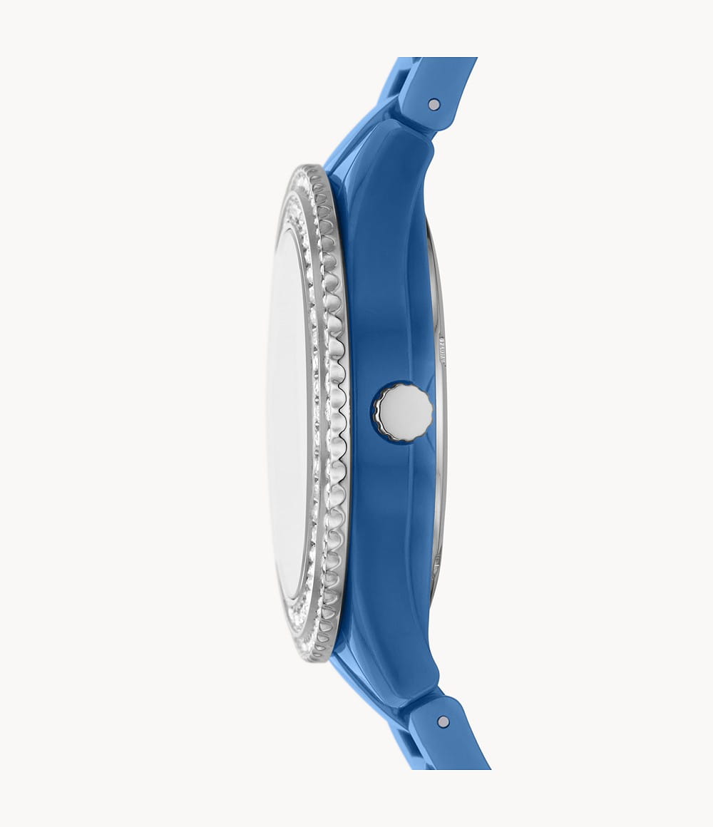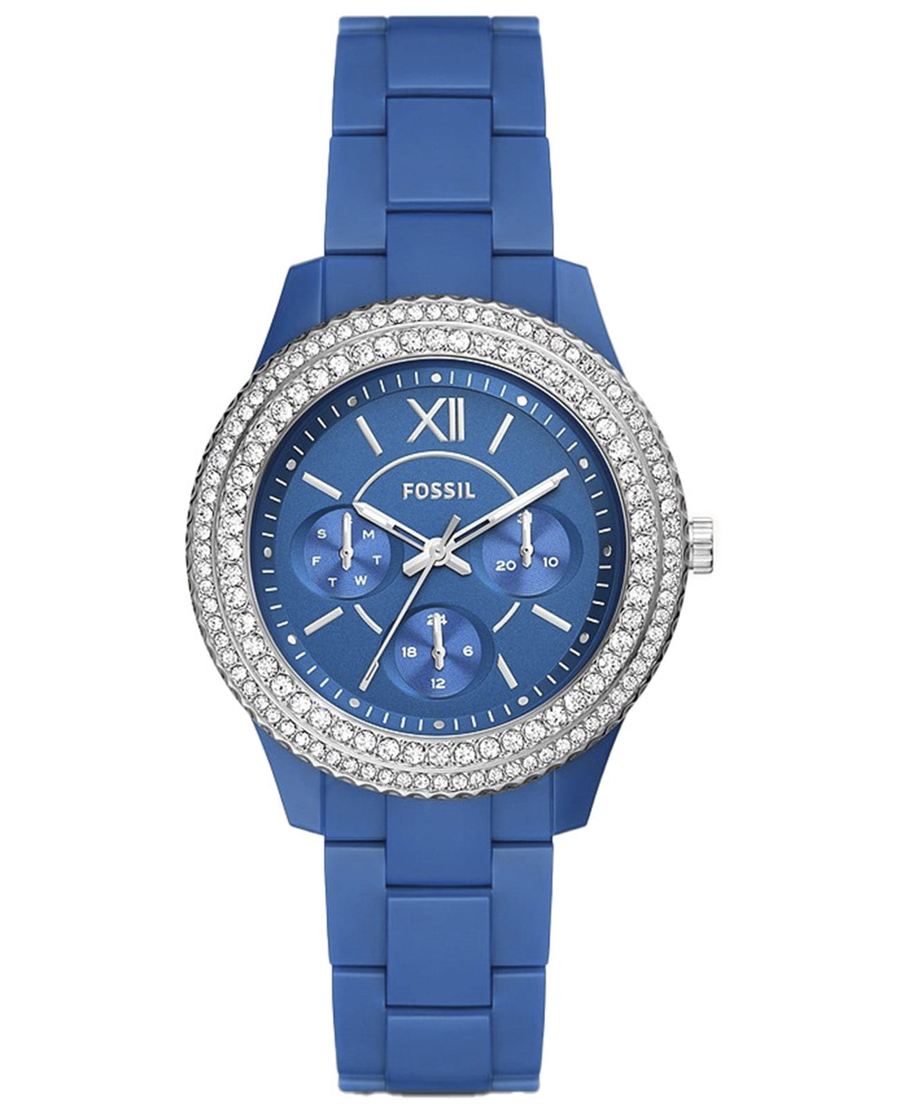 Женские американские часы с паве из кристаллов Fossil Stella ES5193, кварцевый механизм с высокой точностью. Класс водозащиты: 50 метров, позволит защитить корпус от случайных брызг или капель дождя. Круглый корпус часов изготовлен из пластика синего цвета. БезельБезельВнешний ободок, закрепляющий стекло. В спортивных часах так называется поворотное кольцо с делениями на циферблате, выполняет роль таймера – замеряет отрезки времени на шкале. Неподвижный безель – элемент декора. Однонаправленно вращающийся безель на дайверских часах позволяет фиксировать моменты погружения и выныривания на поверхность. украшен паве из кристаллов. Метки в виде штрихов, 12-ти часовая метка в виде римской цифры. 24 индикация, дата и день недели вынесены на малые циферблаты. Рифленая заводная головка. Браслет пластиковый синего цвета.