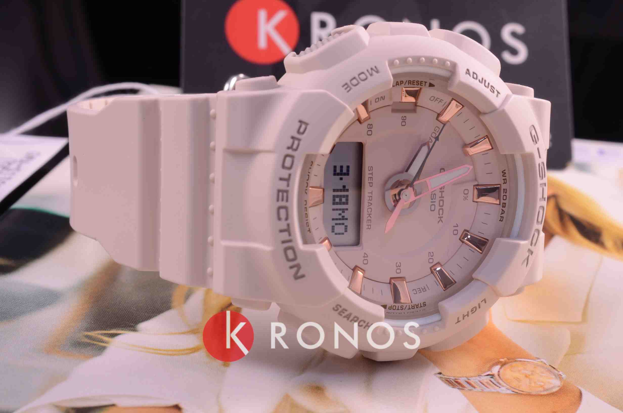 Модель оснащена функцией STEP TRACKER Это шагомер, с помощью которого можно отслеживать физическую активность Это не первые часы из линейки G-Shock, в которых присутствует шагомер Их можно сравнить с модификацией BGS-100, поскольку GMA-S130PA-4AER имеют схожий внешний вид