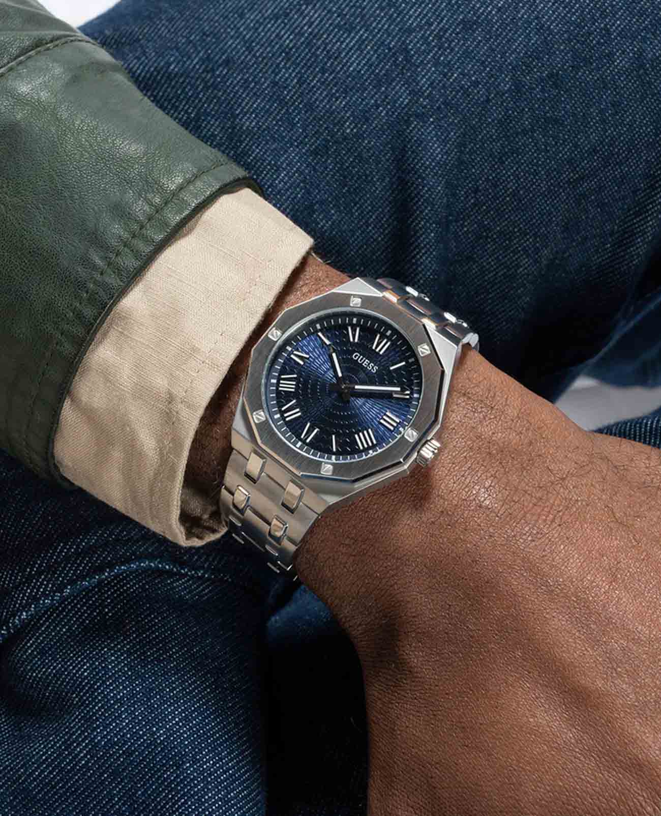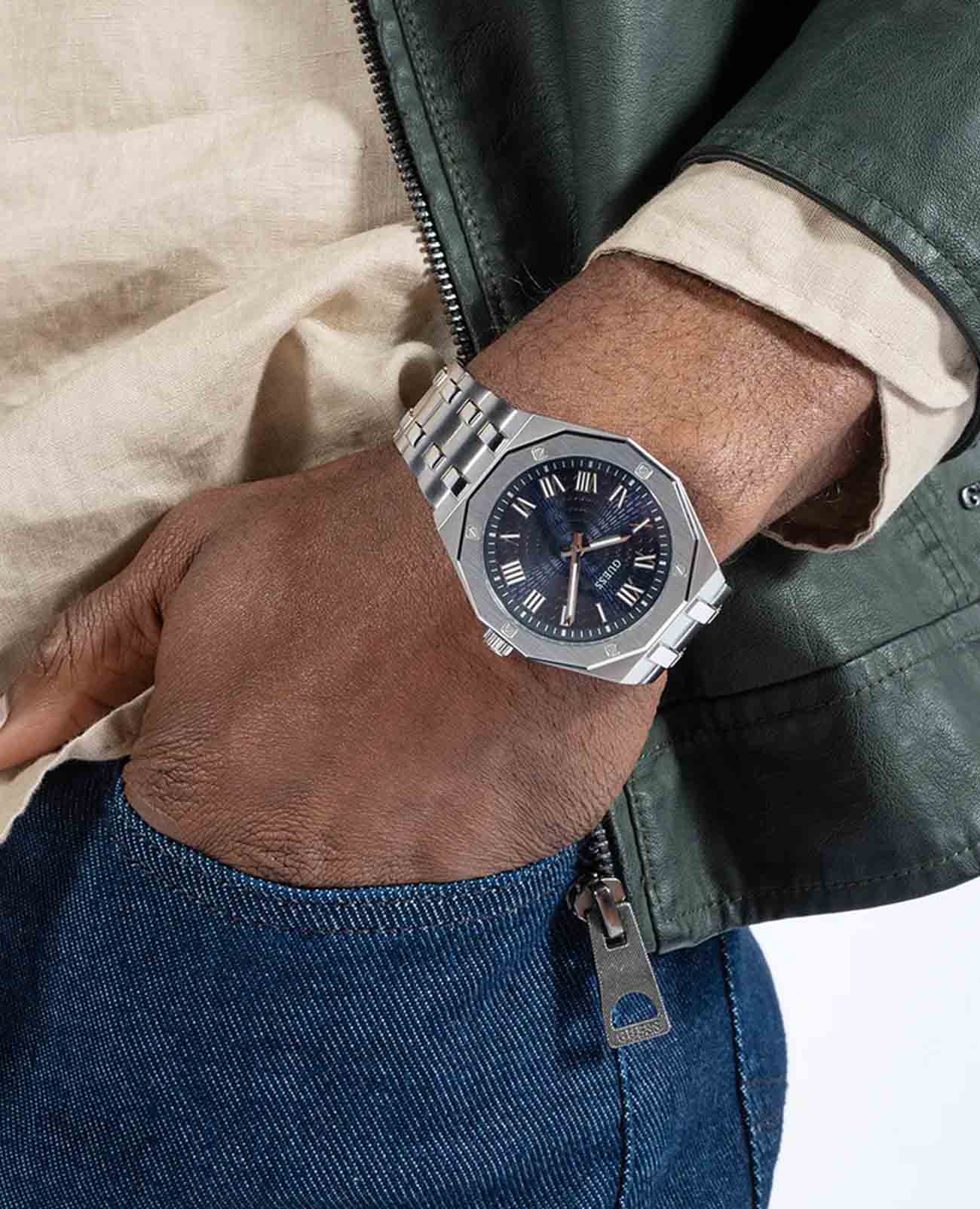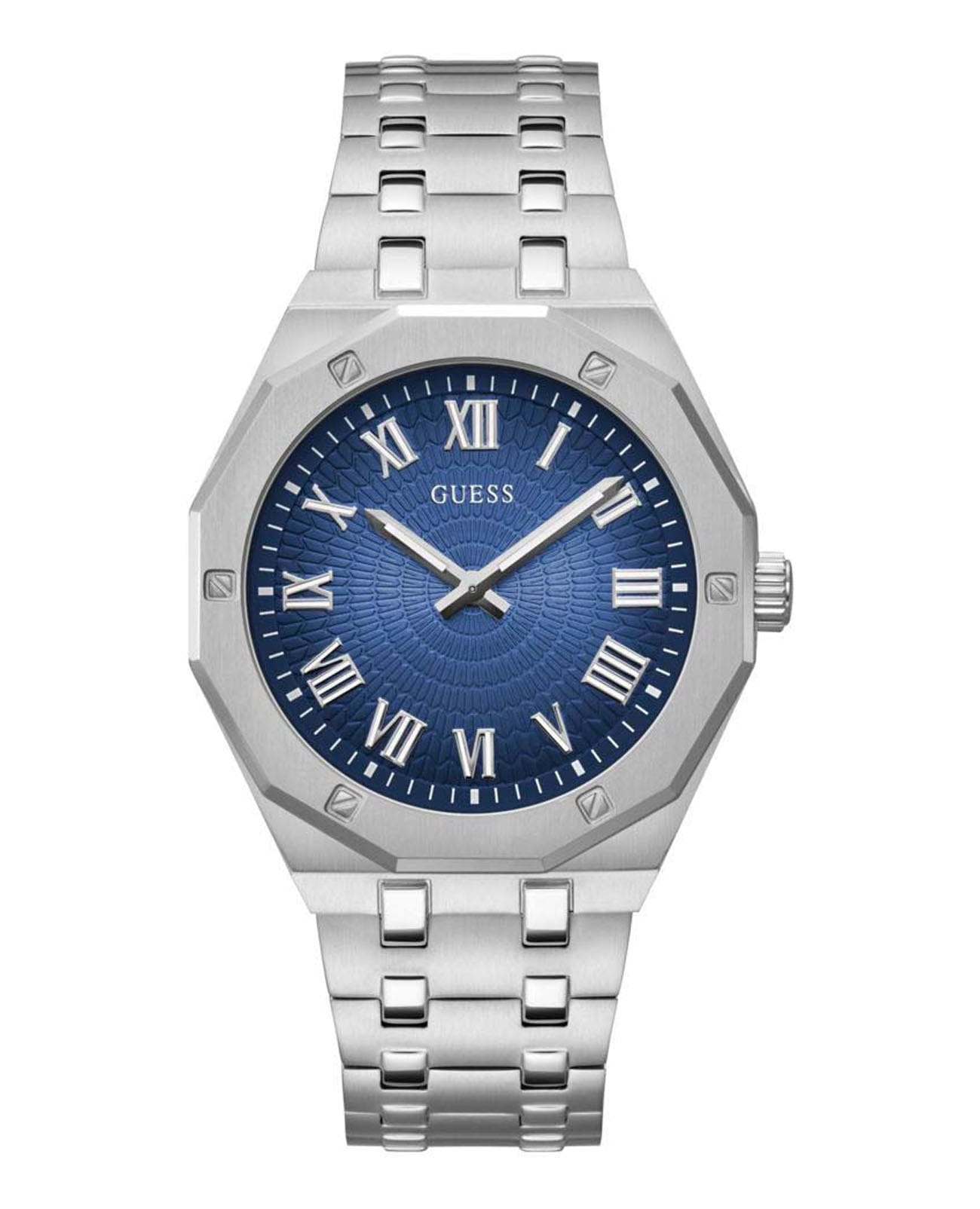 Guess Dress GW0575G4 – стильные мужские часы с современным дизайном и функциональностью. Корпус диаметром 42,5 мм выполнен из нержавеющей стали с восьмиугольной формой и декоративными винтами, что придаёт модели уникальный вид. Синий циферблат с римскими цифрами защищён минеральным стекломМинеральное стеклоМинеральное стекло представляет собой искусственно выращенный минерал кварца. Такое стекло отличается особой устойчивостью к повреждениям и царапинам. Уступает по некоторым качествам сапфировому стеклу., устойчивым к царапинам.
