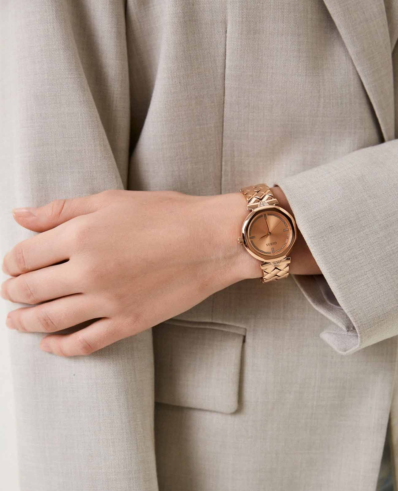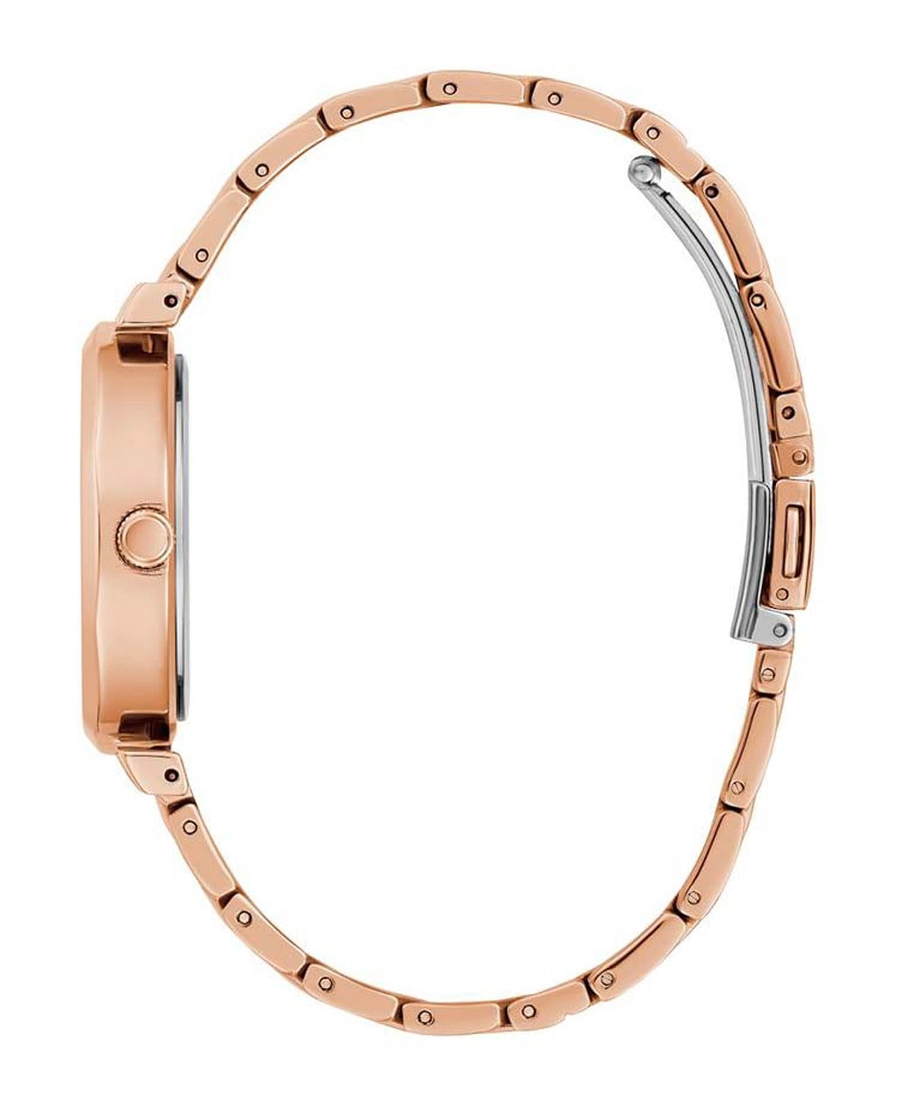 Женские наручные часы Guess GW0613L3 с минеральным стекломМинеральное стеклоМинеральное стекло представляет собой искусственно выращенный минерал кварца. Такое стекло отличается особой устойчивостью к повреждениям и царапинам. Уступает по некоторым качествам сапфировому стеклу., кварцевый механизм с высокой точностью. Корпус часов изготовлен из стали с PVD-покрытиемPVDУльтратонкое покрытие наносится в технике вакуумного напыления, сочетает в себе нитрид титана особой прочности со слоем золота или оксида хрома. Несёт в себе декоративную или защитную функцию.. Циферблат украшен кристаллами. Рифленая заводная головка. Класс водозащиты: 30 метров, позволит защитить корпус от случайных брызг или капель дождя. Браслет с PVD-покрытиемPVDУльтратонкое покрытие наносится в технике вакуумного напыления, сочетает в себе нитрид титана особой прочности со слоем золота или оксида хрома. Несёт в себе декоративную или защитную функцию. на раскладной застёжкеРаскладная застёжкаТакой тип застёжки используется только на браслетах из металла. Она никогда не раскрывается полностью, происходит разделение на 2 и более частей. Раскладывающая застёжка снизит вероятность потери часов к минимуму..
