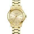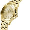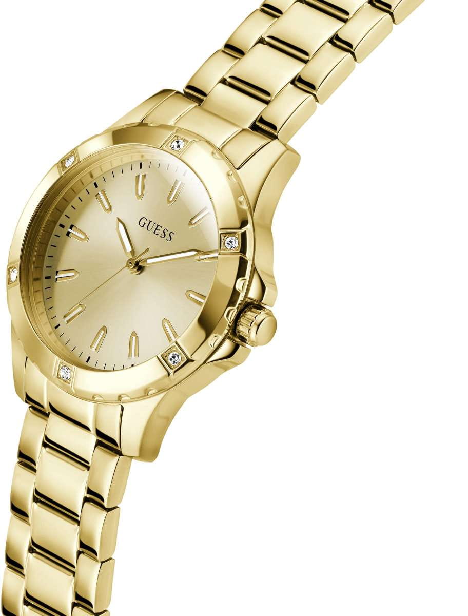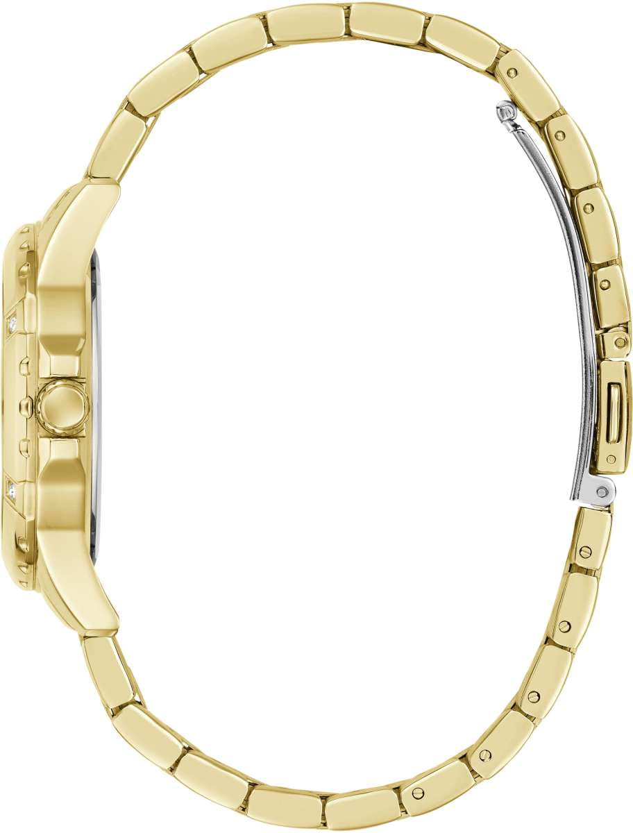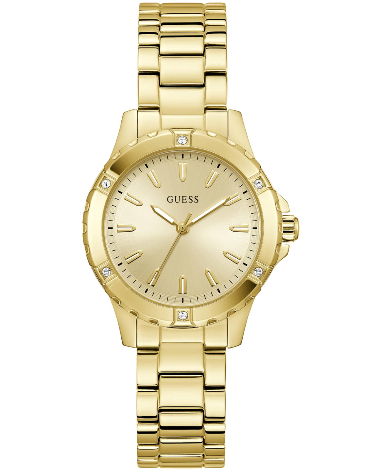 Женские наручные часы Guess Sport GW0948L2 — изысканный аксессуар, сочетающий в себе элегантность и современный стиль. Круглый корпус из стали с золотистым IP-покрытиемIP-покрытиеМетод ионного напыления. Демонстрирует повышенную устойчивость к истиранию, окислению и химическим веществам. Под воздействием высокого давления и температуры около 1500°C молекулы металла надёжно соединяются с частицами корпуса часов., диаметром 35 мм придает часам прочность и устойчивость к износу, обеспечивая их привлекательный внешний вид на долгие годы. Циферблат золотого цвета выполнен по технологии Sunray, имитирующей солнечные лучи, и украшен метками в виде штрихов, что придает часам утонченность и изысканность. Минеральное стеклоМинеральное стеклоМинеральное стекло представляет собой искусственно выращенный минерал кварца. Такое стекло отличается особой устойчивостью к повреждениям и царапинам. Уступает по некоторым качествам сапфировому стеклу. защищает циферблат от царапин и других повреждений. Люминесцентное покрытиеЛюминесцентное покрытиеПозволяет считывать показания времени в темноте. Производители наносят на стрелки, часовые индексы, безель или поверхность циферблата светонакопительный состав, дающий холодное свечение. на стрелках обеспечивает отличную видимость в темноте. БезельБезельВнешний ободок, закрепляющий стекло. В спортивных часах так называется поворотное кольцо с делениями на циферблате, выполняет роль таймера – замеряет отрезки времени на шкале. Неподвижный безель – элемент декора. Однонаправленно вращающийся безель на дайверских часах позволяет фиксировать моменты погружения и выныривания на поверхность. дополнен кристаллами, которые добавляют аксессуару оригинальность и характер. Рифленая заводная головка обеспечивает удобство в использовании и подчеркивает внимание к деталям. Часы оснащены стальным браслетом с золотистым IP-покрытиемIP-покрытиеМетод ионного напыления. Демонстрирует повышенную устойчивость к истиранию, окислению и химическим веществам. Под воздействием высокого давления и температуры около 1500°C молекулы металла надёжно соединяются с частицами корпуса часов., который обеспечивает надежность и комфорт. Раскладная застежкаРаскладная застёжкаТакой тип застёжки используется только на браслетах из металла. Она никогда не раскрывается полностью, происходит разделение на 2 и более частей. Раскладывающая застёжка снизит вероятность потери часов к минимуму. гарантирует легкость и безопасность при ношении. Водозащита уровня 50WR защищает часы от случайных брызг, делая их подходящими для повседневного использования.