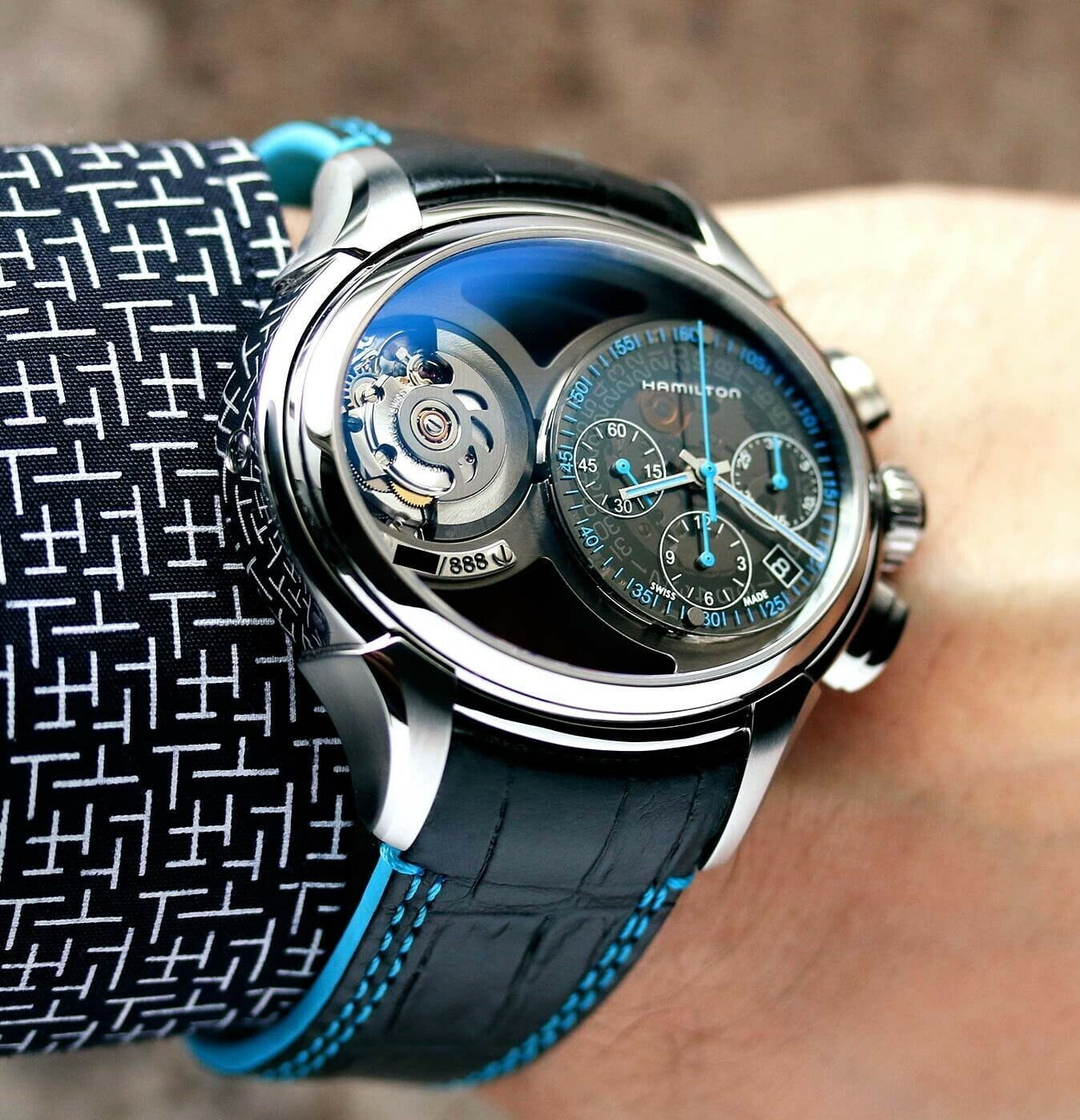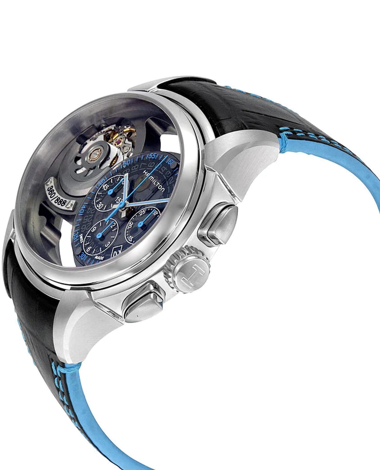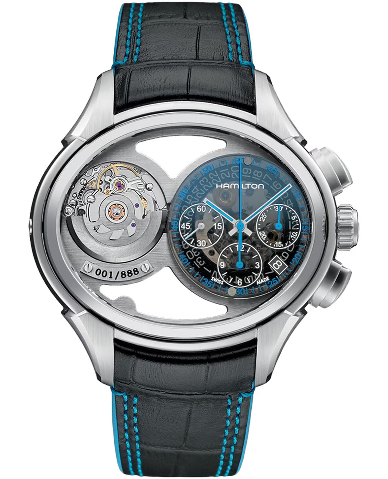 Мужские лимитированные двусторонние часы-скелетоны с двумя циферблатами Hamilton Jazzmaster Face 2 Face Limited Edition H32856705. Надёжным механизм с автоматическим подзаводом. Корпус часов изготовлен из нержавеющей стали. Сапфировое стеклоСапфировое стеклоПрочный и надёжный материал из кристалла сапфира синтетического происхождения, характеризующийся особой твёрдостью и устойчивостью к царапинам и повреждениям. устойчивое к мелким механическим повреждениям. Кожаный ремешок с раскладной застёжкойРаскладная застёжкаТакой тип застёжки используется только на браслетах из металла. Она никогда не раскрывается полностью, происходит разделение на 2 и более частей. Раскладывающая застёжка снизит вероятность потери часов к минимуму.. Стрелки с люминесцентным покрытиемЛюминесцентное покрытиеПозволяет считывать показания времени в темноте. Производители наносят на стрелки, часовые индексы, безель или поверхность циферблата светонакопительный состав, дающий холодное свечение.. Класс водозащиты: 50 метров, позволит защитить корпус от случайных брызг или капель дождя. Часы можно носить двумя способами, обе стороны могут быть настроены на разные часовые пояса.