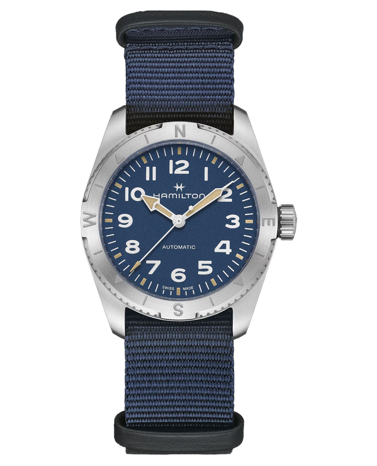 Мужские механические швейцарские часы Hamilton Khaki Field Expedition Auto H70225940, механический механизм (автоматический калибр) с высокой точностью. Сапфировое стеклоСапфировое стеклоПрочный и надёжный материал из кристалла сапфира синтетического происхождения, характеризующийся особой твёрдостью и устойчивостью к царапинам и повреждениям. устойчивое к появлению царапин, обладающее высокой прозрачностью. Класс водозащиты: 100 метров, позволит плавать, нырять и заниматься другими водными видами спорта. Корпус часов изготовлен из нержавеющей стали. Невероятно прочные часы дополнены завинчивающейся заводной головкой и синим циферблатом с пескоструйной обработкой. Текстильный ремешок NATOРемешок NATOРемешок NATO — это прочный, универсальный и сменный часовой ремешок, изначально созданный для военных. Он изготовлен из нейлона или другого прочного материала и имеет уникальную конструкцию, которая позволяет часам оставаться на запястье даже в случае поломки одной из прикрепляющих точек. .