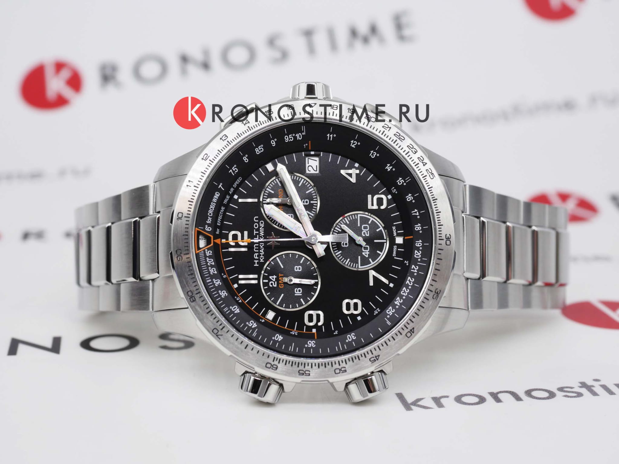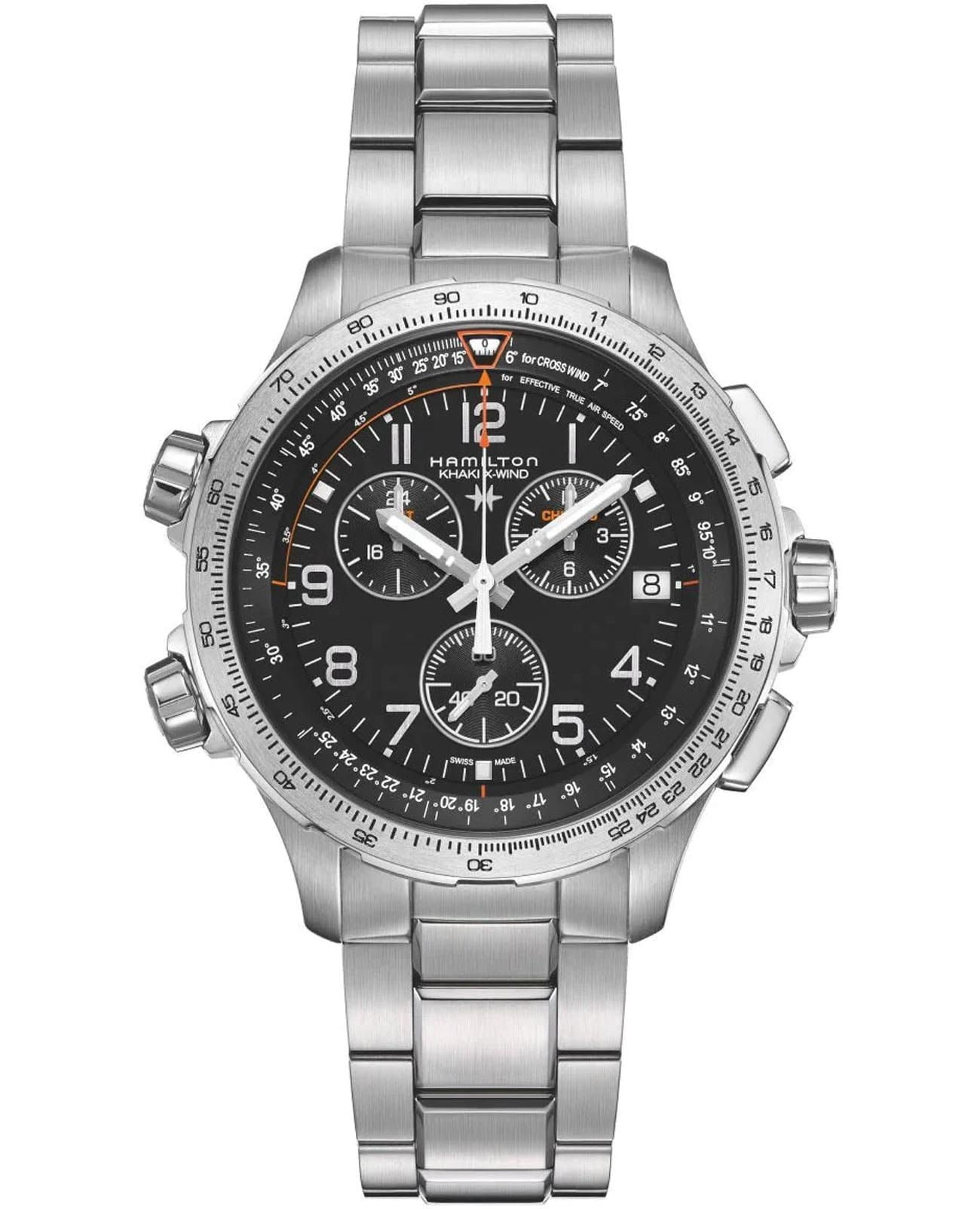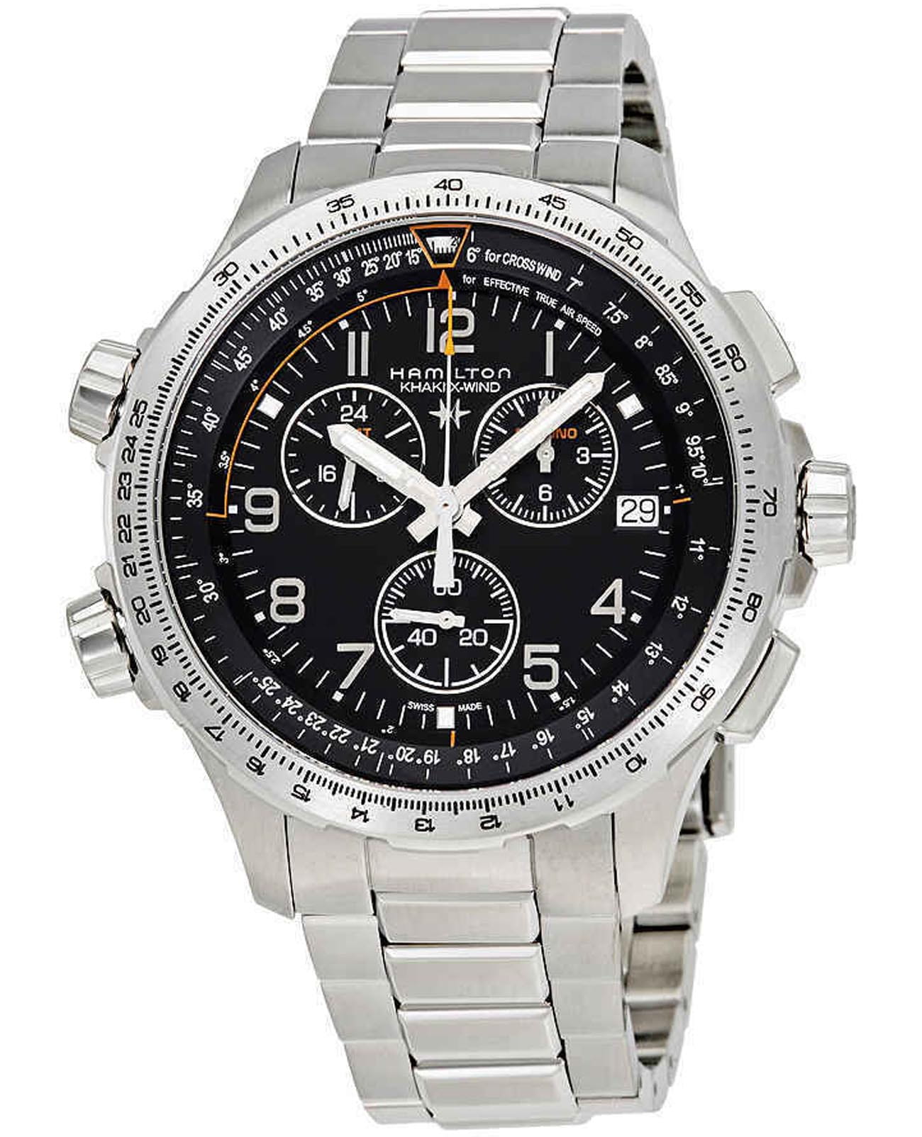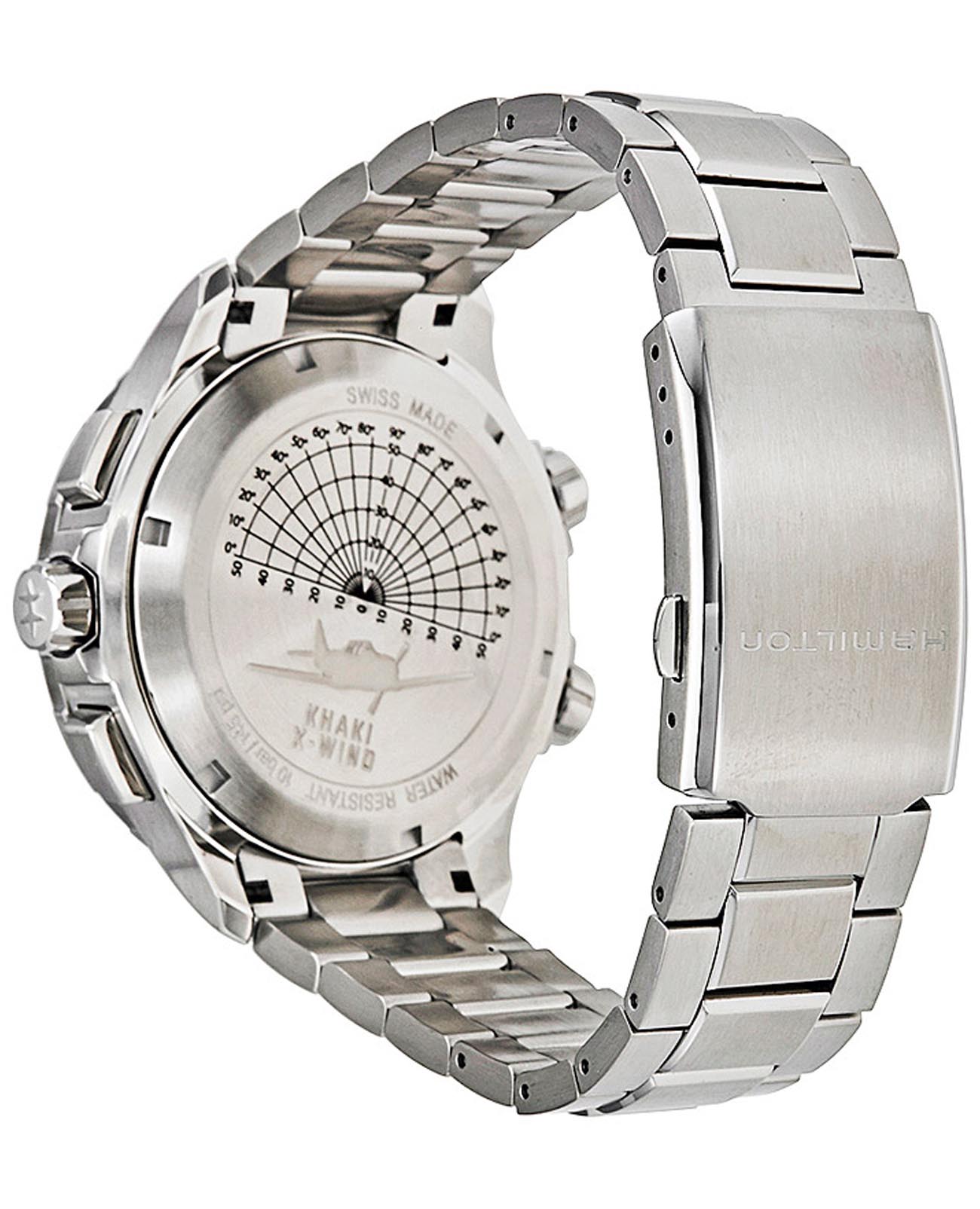 Мужские часы-хронографХронографФункция позволяет измерять отрезки времени с особой точностью: часы, минуты, секунды. Верным признаком хронографа является наличие на циферблате 3 дополнительных окошек-счётчиков. Hamilton Khaki Aviation X-Wind GMT Chrono Quartz H77912135 с надёжным кварцевым механизмом. Корпус часов изготовлен из нержавеющей стали. Стальной браслет на раскладной застёжкеРаскладная застёжкаТакой тип застёжки используется только на браслетах из металла. Она никогда не раскрывается полностью, происходит разделение на 2 и более частей. Раскладывающая застёжка снизит вероятность потери часов к минимуму.. Сапфировое стеклоСапфировое стеклоПрочный и надёжный материал из кристалла сапфира синтетического происхождения, характеризующийся особой твёрдостью и устойчивостью к царапинам и повреждениям. с антибликовым покрытием. Второй часовой поясВторой часовой поясФункция, позволяющая отображать время двух часовых поясов одновременно., вычисление поправки на ветер, окошко даты находится в положении 3 часа. Стрелки и метки с люминесцентным покрытиемЛюминесцентное покрытиеПозволяет считывать показания времени в темноте. Производители наносят на стрелки, часовые индексы, безель или поверхность циферблата светонакопительный состав, дающий холодное свечение.. Уровень влагозащиты: 100 метров, позволит плавать, нырять и заниматься другими водными видами спорта.