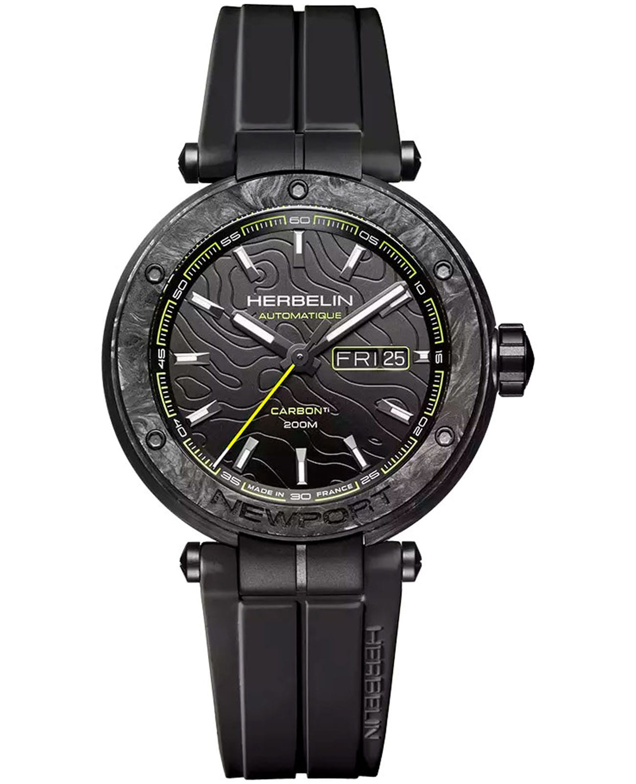Мужские механические часы с автоподзаводом Herbelin Newport 1788CTN14CA – отражающий идеальное сочетание современного дизайна, надёжности и функциональности. Элегантный облик станет превосходным завершением образа, наделив его индивидуальным характером. Корпус из титана с DLC-покрытиемDLC-покрытиеDiamond like carbon - одно из лучших видов покрытия, представляющее собой углерод с алмазными свойствами. На поверхность материала наносятся распавшиеся молекулы углерода, превращающиеся в плёнку из алмазоподобных связей, которая перенимает твёрдость алмаза. черного цвета, диаметром 43 мм, идеально сбалансирован и элегантен. Сапфировое стеклоСапфировое стеклоПрочный и надёжный материал из кристалла сапфира синтетического происхождения, характеризующийся особой твёрдостью и устойчивостью к царапинам и повреждениям. защищает циферблат от царапин и устойчивое к механическим повреждениям. Карбоновый безельБезельВнешний ободок, закрепляющий стекло. В спортивных часах так называется поворотное кольцо с делениями на циферблате, выполняет роль таймера – замеряет отрезки времени на шкале. Неподвижный безель – элемент декора. Однонаправленно вращающийся безель на дайверских часах позволяет фиксировать моменты погружения и выныривания на поверхность.. Окошко даты находится в положении 3 часа. Стрелки и метки с люминесцентным покрытиемЛюминесцентное покрытиеПозволяет считывать показания времени в темноте. Производители наносят на стрелки, часовые индексы, безель или поверхность циферблата светонакопительный состав, дающий холодное свечение.. Каучуковый ремешок на раскладной застёжке с фиксаторомРаскладная застёжкаТакой тип застёжки используется только на браслетах из металла. Она никогда не раскрывается полностью, происходит разделение на 2 и более частей. Раскладывающая застёжка снизит вероятность потери часов к минимуму. обеспечивает комфортное ношение. Водозащита 200 метров позволит плавать, нырять и заниматься другими водными видами спорта. Эта модель – отличный выбор для тех, кто ищет сочетание стиля, качества и функциональности. Часы станут не только полезным аксессуаром, но и выразительным элементом вашего имиджа.