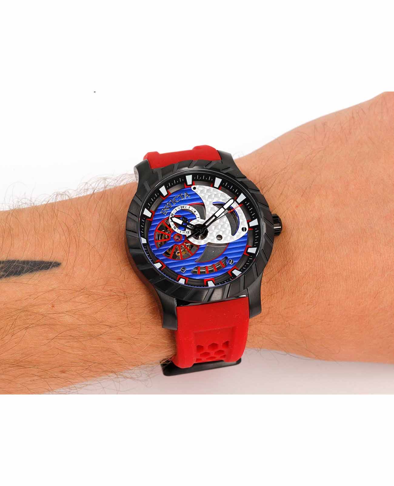 Мужские наручные часы Invicta Specialty IN31988 из коллекции Specialty сочетают в себе спортивный дизайн и надежность современных технологий. Модель обладает круглым корпусом диаметром 45 мм, выполненным из нержавеющей стали с IP-покрытиемIP-покрытиеМетод ионного напыления. Демонстрирует повышенную устойчивость к истиранию, окислению и химическим веществам. Под воздействием высокого давления и температуры около 1500°C молекулы металла надёжно соединяются с частицами корпуса часов., что обеспечивает высокую устойчивость к внешним воздействиям. Многослойный циферблат украшен металлическими панелями, закрепленными винтами. Заостренные прямоугольные стрелки в стиле Baton. Метки в виде штрихов. Ремешок часов изготовлен из красного силикона, гарантируя комфортное ношение и безопасность .  Циферблат дополнен индексными метками и светящимися стрелками с люминесцентным покрытиемЛюминесцентное покрытиеПозволяет считывать показания времени в темноте. Производители наносят на стрелки, часовые индексы, безель или поверхность циферблата светонакопительный состав, дающий холодное свечение., которые обеспечивают отличную видимость даже в темноте . На циферблате также присутствуют минутные деления по внешнему ободку, а также один малый циферблат для дополнительных функций . Для защиты используется минеральное стеклоМинеральное стеклоМинеральное стекло представляет собой искусственно выращенный минерал кварца. Такое стекло отличается особой устойчивостью к повреждениям и царапинам. Уступает по некоторым качествам сапфировому стеклу. Flame Fusion, которое обеспечивает прочность и устойчивость к царапинам .  Часы оснащены автоматическим механизмом, что гарантирует точность хода без необходимости подзаводки . Водонепроницаемость модели достигает 100 метров (10 атмосфер), что позволяет использовать их во время плавания и других водных видов спорта, однако не рекомендуется для глубоководного дайвинга . Сочетание практичности, надежности и стильного дизайна делает эту модель универсальным аксессуаром как для повседневной носки, так и для занятий спортом .