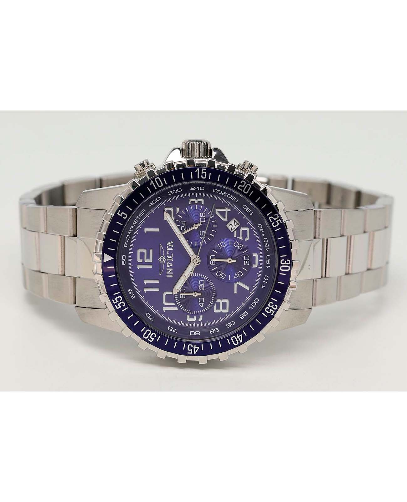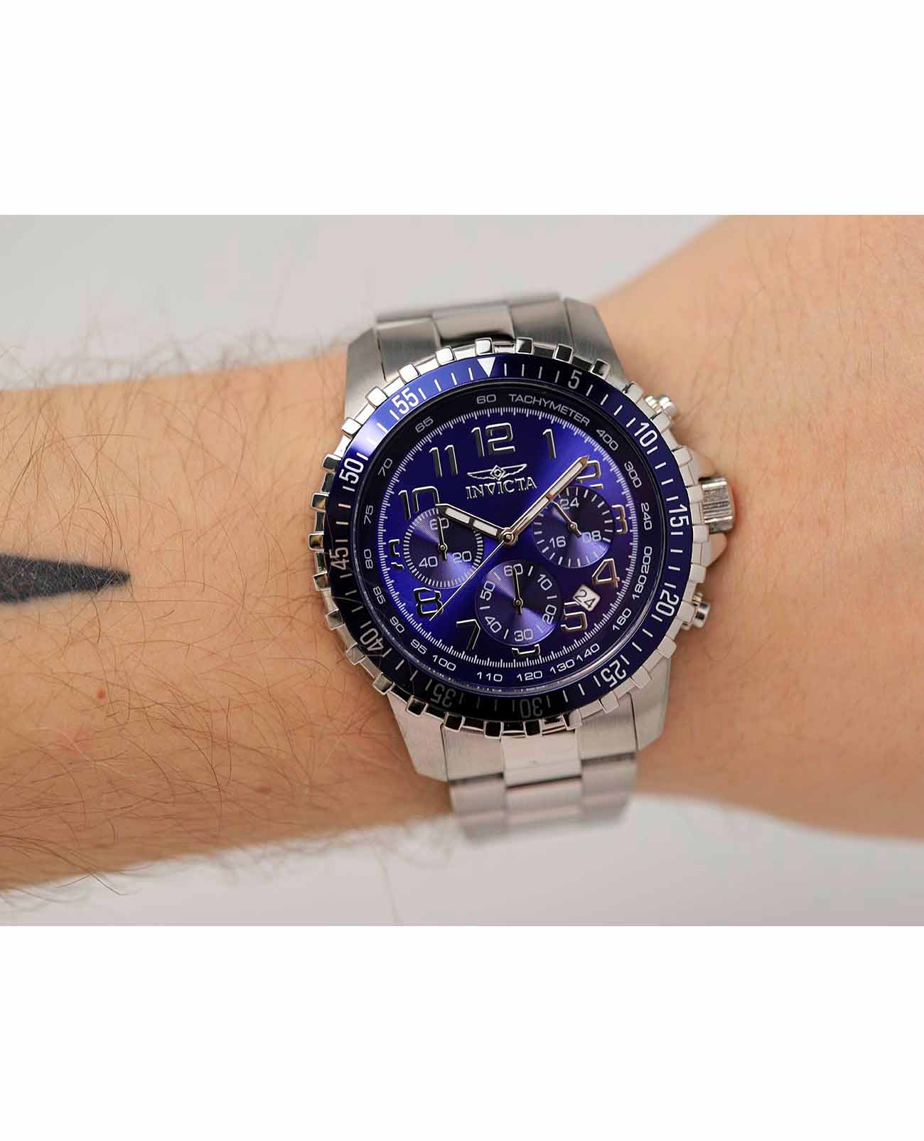 Мужские наручные часы-хронографХронографФункция позволяет измерять отрезки времени с особой точностью: часы, минуты, секунды. Верным признаком хронографа является наличие на циферблате 3 дополнительных окошек-счётчиков. Invicta Specialty IN6621 из коллекции Specialty сочетают в себе спортивный дизайн и надежность современных технологий . Модель обладает круглым корпусом диаметром 45 мм, изготовленным из нержавеющей стали, что обеспечивает высокую устойчивость к внешним воздействиям . БезельБезельВнешний ободок, закрепляющий стекло. В спортивных часах так называется поворотное кольцо с делениями на циферблате, выполняет роль таймера – замеряет отрезки времени на шкале. Неподвижный безель – элемент декора. Однонаправленно вращающийся безель на дайверских часах позволяет фиксировать моменты погружения и выныривания на поверхность. с IP-покрытиемIP-покрытиеМетод ионного напыления. Демонстрирует повышенную устойчивость к истиранию, окислению и химическим веществам. Под воздействием высокого давления и температуры около 1500°C молекулы металла надёжно соединяются с частицами корпуса часов. выполнен с рифленой отделкой, придающей часам дополнительную элегантность . Браслет также выполнен из нержавеющей стали с раскладывающейся застежкойРаскладная застёжкаТакой тип застёжки используется только на браслетах из металла. Она никогда не раскрывается полностью, происходит разделение на 2 и более частей. Раскладывающая застёжка снизит вероятность потери часов к минимуму., гарантирующей комфортное ношение и безопасность . Синий циферблат дополнен метками в виде штрихов и светящимися стрелками с люминесцентным покрытиемЛюминесцентное покрытиеПозволяет считывать показания времени в темноте. Производители наносят на стрелки, часовые индексы, безель или поверхность циферблата светонакопительный состав, дающий холодное свечение., которые обеспечивают отличную видимость даже в темное время суток . Для защиты используется минеральное стеклоМинеральное стеклоМинеральное стекло представляет собой искусственно выращенный минерал кварца. Такое стекло отличается особой устойчивостью к повреждениям и царапинам. Уступает по некоторым качествам сапфировому стеклу., оснащенное антибликовым покрытием, что делает его устойчивым к царапинам и бликам . Часы оснащены кварцевым механизмом, что гарантирует точность хода без необходимости подзаводки . Модель также является хронографомХронографФункция позволяет измерять отрезки времени с особой точностью: часы, минуты, секунды. Верным признаком хронографа является наличие на циферблате 3 дополнительных окошек-счётчиков., оснащенным функцией секундомераСекундомерСекундоме́р — прибор, способный измерять интервалы времени с точностью до долей секунды., делая ее идеальной для активного образа жизни . Водонепроницаемость часов достигает 100 метров (10 атмосфер), что позволяет использовать их во время плавания и других водных видов спорта, однако не рекомендуется для глубоководного дайвинга . Сочетание практичности, надежности и стильного дизайна делает эту модель универсальным аксессуаром как для повседневной носки, так и для занятий спортом.