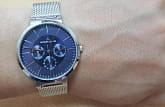 Стильно смотрится стальной браслет миланского плетения. На синем циферблате расположились симметричные функциональные счётчики. Кварцевый японский калибр Epson. Минеральное стекло со специальной закалкой. Водостойкость до 5 бар. Индикация числа и дня недели. Отображение времени в 12/24-х часовом формате.