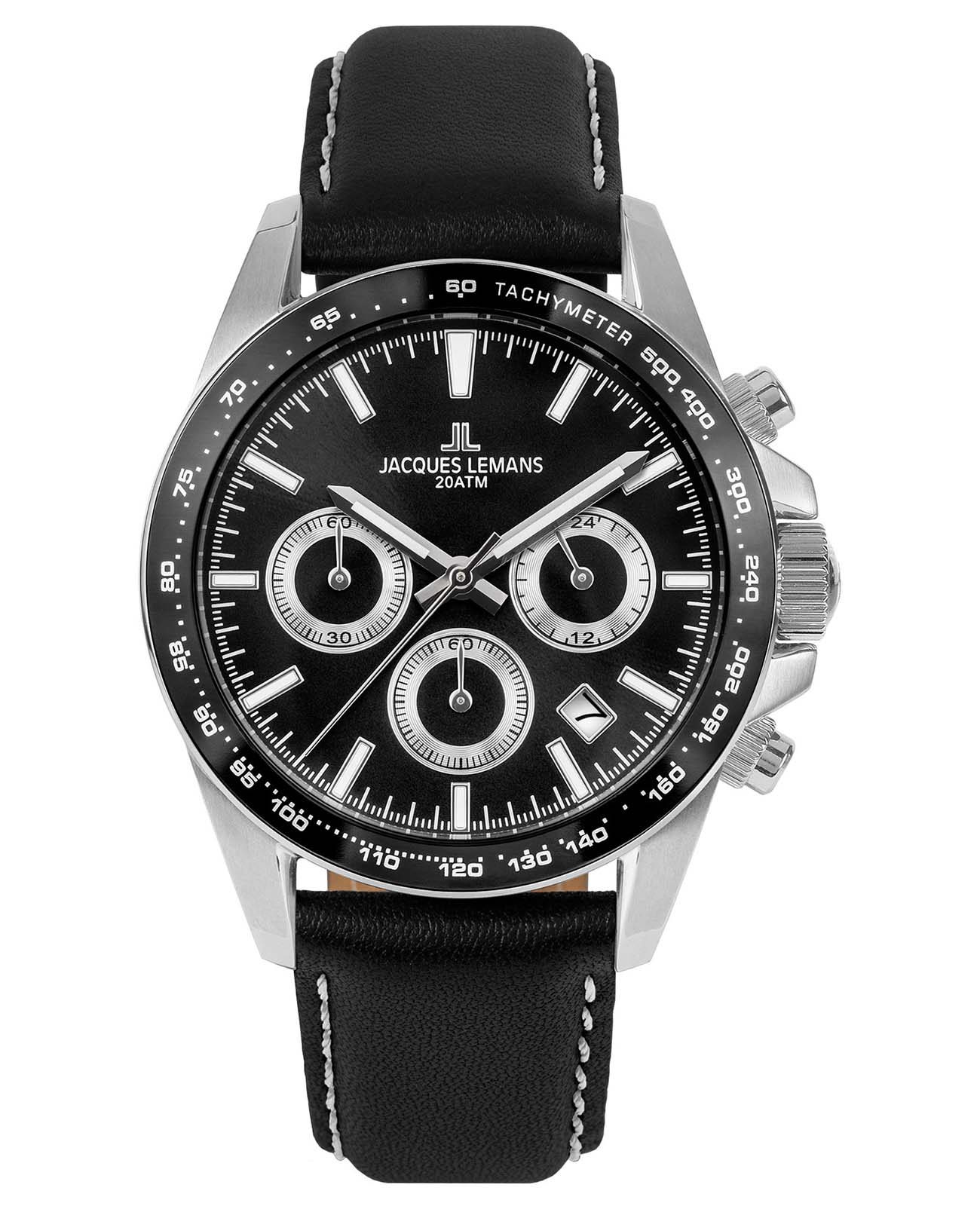 Мужские часы Jacques Lemans Liverpool 1-1877A с минеральным стекломМинеральное стеклоМинеральное стекло представляет собой искусственно выращенный минерал кварца. Такое стекло отличается особой устойчивостью к повреждениям и царапинам. Уступает по некоторым качествам сапфировому стеклу., кварцевый механизм с высокой точностью. Часы- хронографХронографФункция позволяет измерять отрезки времени с особой точностью: часы, минуты, секунды. Верным признаком хронографа является наличие на циферблате 3 дополнительных окошек-счётчиков. с секундомеромСекундомерСекундоме́р — прибор, способный измерять интервалы времени с точностью до долей секунды. представляют собой стильный аксессуар, отражающий идеальное сочетание современного дизайна, надёжности и функциональности. Неподвижный безельБезельВнешний ободок, закрепляющий стекло. В спортивных часах так называется поворотное кольцо с делениями на циферблате, выполняет роль таймера – замеряет отрезки времени на шкале. Неподвижный безель – элемент декора. Однонаправленно вращающийся безель на дайверских часах позволяет фиксировать моменты погружения и выныривания на поверхность. из нержавеющей стали с PVDPVDУльтратонкое покрытие наносится в технике вакуумного напыления, сочетает в себе нитрид титана особой прочности со слоем золота или оксида хрома. Несёт в себе декоративную или защитную функцию. покрытием и с тахиметромТахиметрРазмеченная шкала, располагается на ободке или безеле часов. Тахиметр позволяет рассчитать скорость на определённом участке пути, расстояние измеряется в километрах или милях.. На циферблате расположены два дополнительных индикатора и окошко даты. Стрелки и метки с люминесцентным покрытиемЛюминесцентное покрытиеПозволяет считывать показания времени в темноте. Производители наносят на стрелки, часовые индексы, безель или поверхность циферблата светонакопительный состав, дающий холодное свечение.. Класс водозащиты: 200 метров, позволит плавать, нырять и заниматься другими водными видами спорта. Рифленая заводная головка с защитой. Ремешок из натуральной кожи на стандартной застежке.