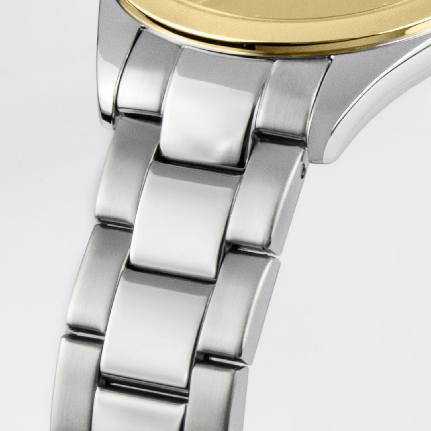 Женские часы Jacques Lemans Classic 1-1878E с минеральным стекломМинеральное стеклоМинеральное стекло представляет собой искусственно выращенный минерал кварца. Такое стекло отличается особой устойчивостью к повреждениям и царапинам. Уступает по некоторым качествам сапфировому стеклу., кварцевый механизм с высокой точностью. Корпус из нержавеющей стали. Неподвижный безельБезельВнешний ободок, закрепляющий стекло. В спортивных часах так называется поворотное кольцо с делениями на циферблате, выполняет роль таймера – замеряет отрезки времени на шкале. Неподвижный безель – элемент декора. Однонаправленно вращающийся безель на дайверских часах позволяет фиксировать моменты погружения и выныривания на поверхность. из нержавеющей стали с PVDPVDУльтратонкое покрытие наносится в технике вакуумного напыления, сочетает в себе нитрид титана особой прочности со слоем золота или оксида хрома. Несёт в себе декоративную или защитную функцию. покрытием. Стрелки с люминесцентным покрытиемЛюминесцентное покрытиеПозволяет считывать показания времени в темноте. Производители наносят на стрелки, часовые индексы, безель или поверхность циферблата светонакопительный состав, дающий холодное свечение.. Окошко даты расположено в позиции «3 часа».  Класс водозащиты: 100 метров, позволит плавать, нырять и заниматься другими водными видами спорта. Браслет из нержавеющей стали на раскладной застёжкеРаскладная застёжкаТакой тип застёжки используется только на браслетах из металла. Она никогда не раскрывается полностью, происходит разделение на 2 и более частей. Раскладывающая застёжка снизит вероятность потери часов к минимуму..