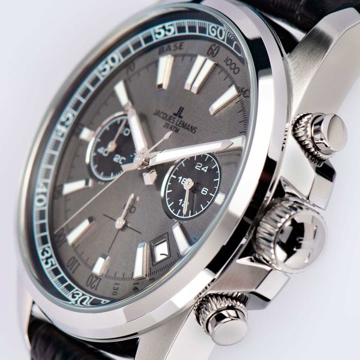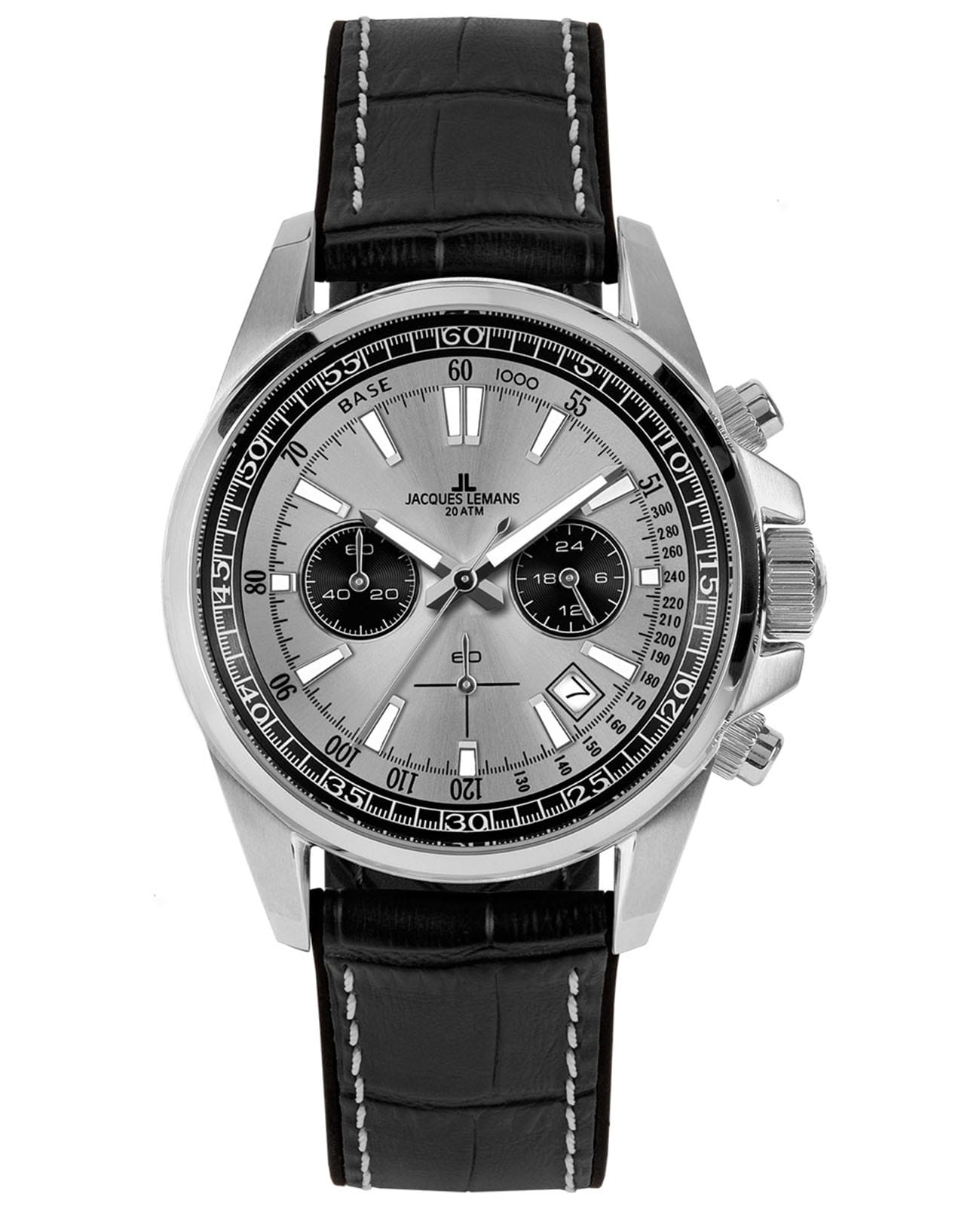 Мужские часы Jacques Lemans Liverpool 1-2117Q с минеральным стекломМинеральное стеклоМинеральное стекло представляет собой искусственно выращенный минерал кварца. Такое стекло отличается особой устойчивостью к повреждениям и царапинам. Уступает по некоторым качествам сапфировому стеклу., кварцевый механизм с высокой точностью. Часы- хронографХронографФункция позволяет измерять отрезки времени с особой точностью: часы, минуты, секунды. Верным признаком хронографа является наличие на циферблате 3 дополнительных окошек-счётчиков. с секундомеромСекундомерСекундоме́р — прибор, способный измерять интервалы времени с точностью до долей секунды. представляют собой стильный аксессуар, отражающий идеальное сочетание современного дизайна, надёжности и функциональности. Корпус и безельБезельВнешний ободок, закрепляющий стекло. В спортивных часах так называется поворотное кольцо с делениями на циферблате, выполняет роль таймера – замеряет отрезки времени на шкале. Неподвижный безель – элемент декора. Однонаправленно вращающийся безель на дайверских часах позволяет фиксировать моменты погружения и выныривания на поверхность. из нержавеющей стали с тахиметромТахиметрРазмеченная шкала, располагается на ободке или безеле часов. Тахиметр позволяет рассчитать скорость на определённом участке пути, расстояние измеряется в километрах или милях.. На циферблате расположены два дополнительных индикатора и окошко даты. Окно даты расположено между 4 и 5 часами. Стрелки и метки с люминесцентным покрытиемЛюминесцентное покрытиеПозволяет считывать показания времени в темноте. Производители наносят на стрелки, часовые индексы, безель или поверхность циферблата светонакопительный состав, дающий холодное свечение.. Класс водозащиты: 200 метров, позволит плавать, нырять и заниматься другими водными видами спорта. Рифленая заводная головка с защитой. Ремешок из натуральной кожи (верхняя часть) и силикона (внутренняя часть) на стандартной застежке.