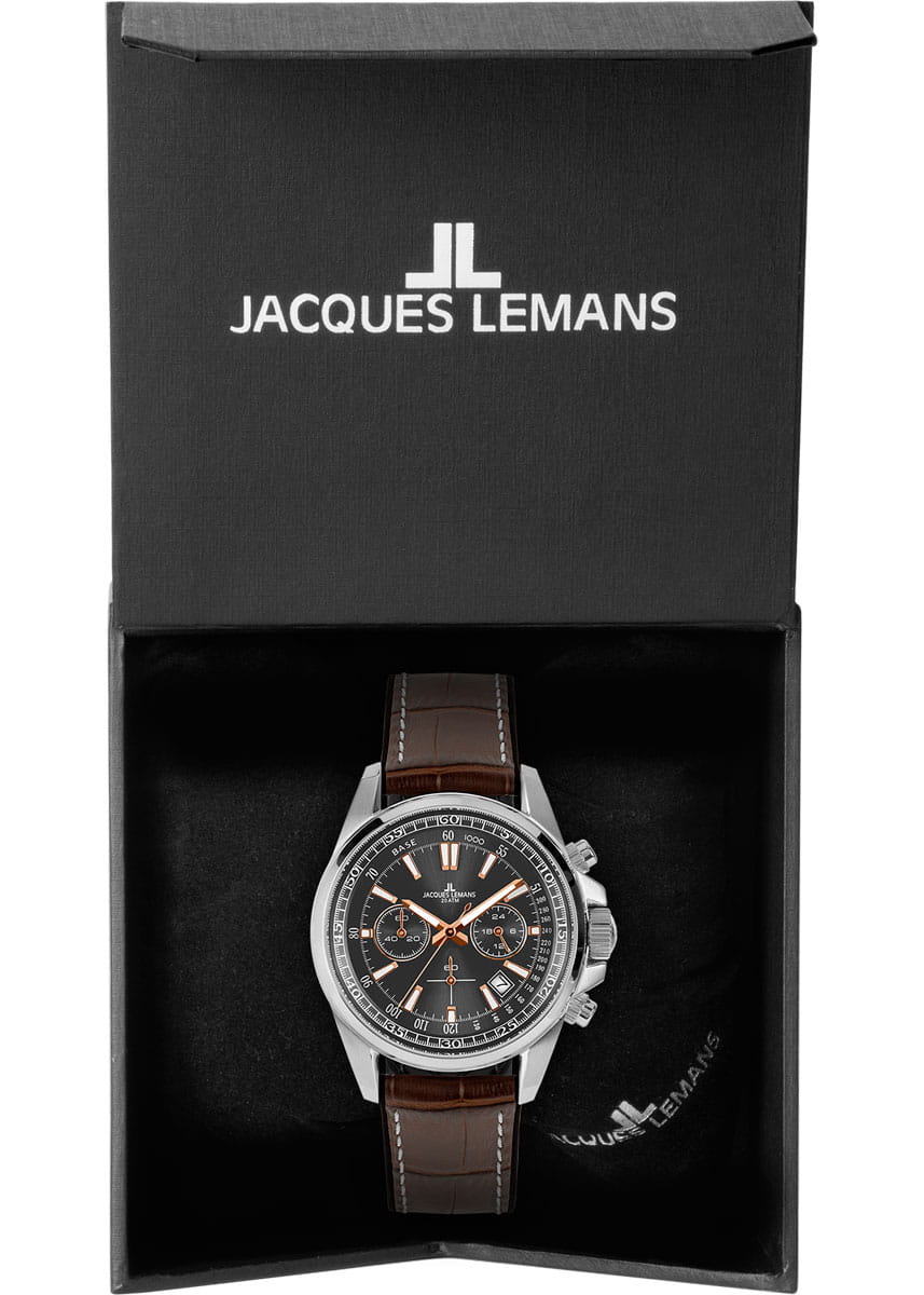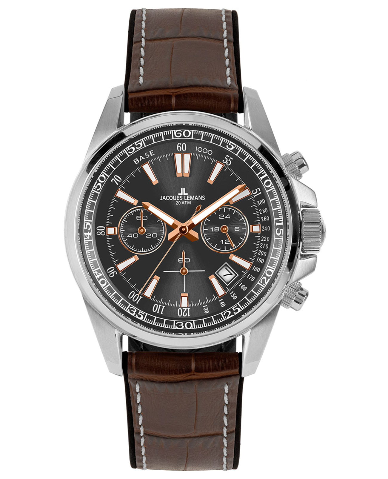 Мужские часы Jacques Lemans Liverpool 1-2117W с минеральным стекломМинеральное стеклоМинеральное стекло представляет собой искусственно выращенный минерал кварца. Такое стекло отличается особой устойчивостью к повреждениям и царапинам. Уступает по некоторым качествам сапфировому стеклу., кварцевый механизм с высокой точностью. Часы- хронографХронографФункция позволяет измерять отрезки времени с особой точностью: часы, минуты, секунды. Верным признаком хронографа является наличие на циферблате 3 дополнительных окошек-счётчиков. с секундомеромСекундомерСекундоме́р — прибор, способный измерять интервалы времени с точностью до долей секунды. представляют собой стильный аксессуар, отражающий идеальное сочетание современного дизайна, надёжности и функциональности.  Корпус и безельБезельВнешний ободок, закрепляющий стекло. В спортивных часах так называется поворотное кольцо с делениями на циферблате, выполняет роль таймера – замеряет отрезки времени на шкале. Неподвижный безель – элемент декора. Однонаправленно вращающийся безель на дайверских часах позволяет фиксировать моменты погружения и выныривания на поверхность. из нержавеющей стали с тахиметромТахиметрРазмеченная шкала, располагается на ободке или безеле часов. Тахиметр позволяет рассчитать скорость на определённом участке пути, расстояние измеряется в километрах или милях.. На циферблате расположены два дополнительных индикатора и окошко даты. Окно даты расположено между 4 и 5 часами. Стрелки и метки с люминесцентным покрытиемЛюминесцентное покрытиеПозволяет считывать показания времени в темноте. Производители наносят на стрелки, часовые индексы, безель или поверхность циферблата светонакопительный состав, дающий холодное свечение.. Класс водозащиты: 200 метров, позволит плавать, нырять и заниматься другими водными видами спорта. Рифленая заводная головка с защитой. Ремешок из натуральной кожи (верхняя часть) и силикона (внутренняя часть) на стандартной застежке.