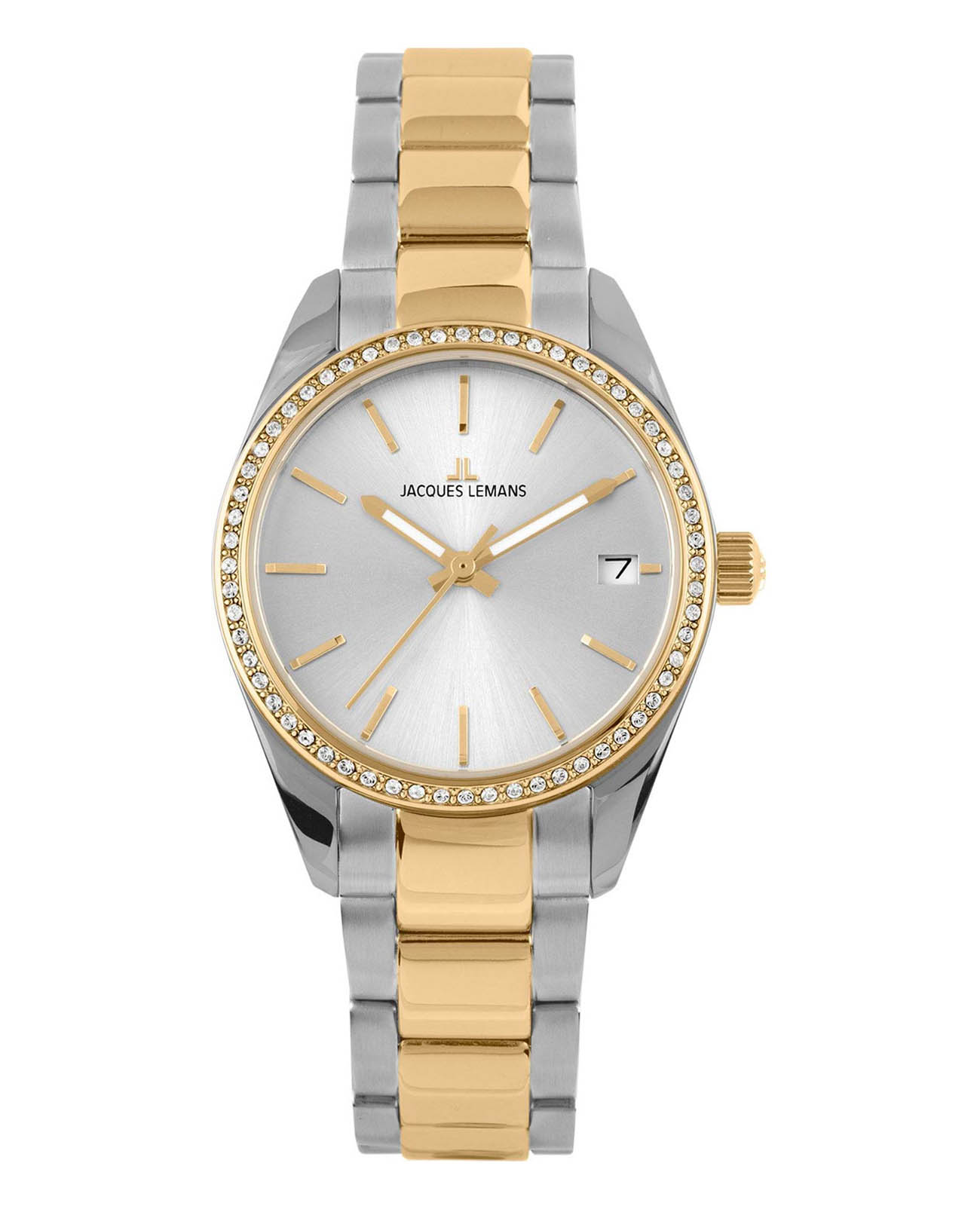 Женские часы Jacques Lemans Classic 1-2133B с минеральным стекломМинеральное стеклоМинеральное стекло представляет собой искусственно выращенный минерал кварца. Такое стекло отличается особой устойчивостью к повреждениям и царапинам. Уступает по некоторым качествам сапфировому стеклу., кварцевый механизм с высокой точностью. Корпус из нержвающей стали. БезельБезельВнешний ободок, закрепляющий стекло. В спортивных часах так называется поворотное кольцо с делениями на циферблате, выполняет роль таймера – замеряет отрезки времени на шкале. Неподвижный безель – элемент декора. Однонаправленно вращающийся безель на дайверских часах позволяет фиксировать моменты погружения и выныривания на поверхность. из нержавеющей стали с PVDPVDУльтратонкое покрытие наносится в технике вакуумного напыления, сочетает в себе нитрид титана особой прочности со слоем золота или оксида хрома. Несёт в себе декоративную или защитную функцию. покрытием украшен кристаллами Swarovski. Стрелки с люминесцентным покрытиемЛюминесцентное покрытиеПозволяет считывать показания времени в темноте. Производители наносят на стрелки, часовые индексы, безель или поверхность циферблата светонакопительный состав, дающий холодное свечение.. Окошко даты находится в положении 3 часа. Класс водозащиты: 100 метров, позволит плавать, нырять и заниматься другими водными видами спорта. Браслет из нержавеющей стали с частичным PVDPVDУльтратонкое покрытие наносится в технике вакуумного напыления, сочетает в себе нитрид титана особой прочности со слоем золота или оксида хрома. Несёт в себе декоративную или защитную функцию. покрытием на раскладной застёжкеРаскладная застёжкаТакой тип застёжки используется только на браслетах из металла. Она никогда не раскрывается полностью, происходит разделение на 2 и более частей. Раскладывающая застёжка снизит вероятность потери часов к минимуму..
