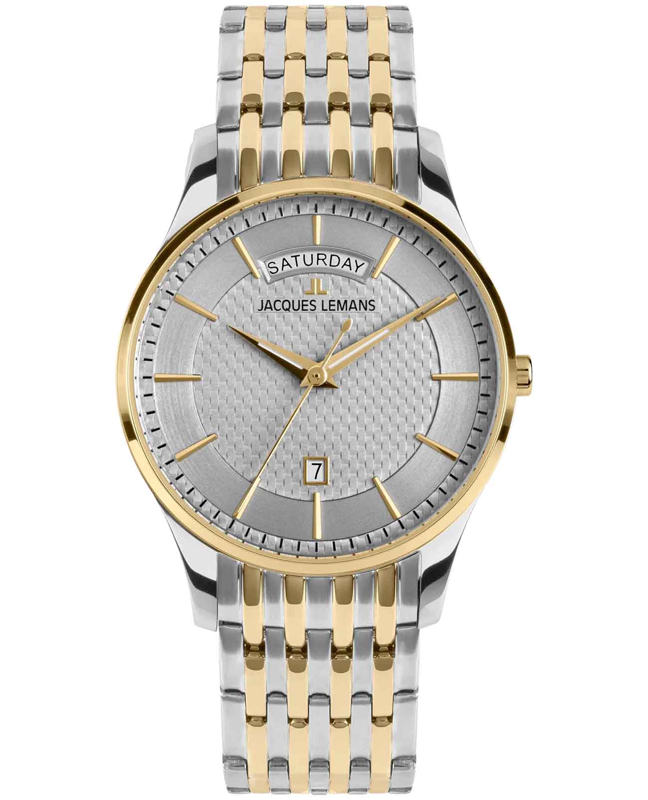 Мужские часы Jacques Lemans 1-2193J – лаконичная красота и изысканная элегантность. Корпус из нержавеющей стали диаметром 40 мм идеально сбалансирован и элегантен. Ударопрочное минеральное стеклоМинеральное стеклоМинеральное стекло представляет собой искусственно выращенный минерал кварца. Такое стекло отличается особой устойчивостью к повреждениям и царапинам. Уступает по некоторым качествам сапфировому стеклу. Crystex защищает циферблат от царапин. Стальной браслет на застёжке-бабочке с кнопкамиЗастёжка "бабочка"Такой вид застёжки дополняется предохранителями, помогающими избежать случайного раскрытия браслета. Обладают изящным исполнением. . Водозащита 50 метров защищает часы от брызг и дождя, делая их подходящими для повседневного использования. Стрелки и метки с люминесцентным покрытиемЛюминесцентное покрытиеПозволяет считывать показания времени в темноте. Производители наносят на стрелки, часовые индексы, безель или поверхность циферблата светонакопительный состав, дающий холодное свечение. позволяющие легко определять время даже в темноте. БезельБезельВнешний ободок, закрепляющий стекло. В спортивных часах так называется поворотное кольцо с делениями на циферблате, выполняет роль таймера – замеряет отрезки времени на шкале. Неподвижный безель – элемент декора. Однонаправленно вращающийся безель на дайверских часах позволяет фиксировать моменты погружения и выныривания на поверхность. с PVD-покрытиемPVDУльтратонкое покрытие наносится в технике вакуумного напыления, сочетает в себе нитрид титана особой прочности со слоем золота или оксида хрома. Несёт в себе декоративную или защитную функцию.. Окошко даты находится в положении 6 часов. Широкое окошко дня недели в положении 12 часов позволяет показывать название дня недели полностью, без сокращений.