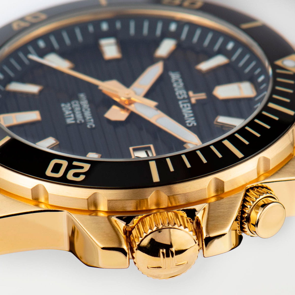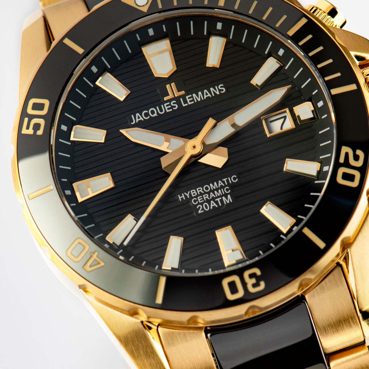 Мужские часы Jacques Lemans Venice 1-2222D с сапфировым стекломСапфировое стеклоПрочный и надёжный материал из кристалла сапфира синтетического происхождения, характеризующийся особой твёрдостью и устойчивостью к царапинам и повреждениям., гибрид кварца и механики с автоподзаводом. Лимитированная серия революционных часов Hybromatic: всего выпущено 999 штук каждой модели. Вращающийся безельБезельВнешний ободок, закрепляющий стекло. В спортивных часах так называется поворотное кольцо с делениями на циферблате, выполняет роль таймера – замеряет отрезки времени на шкале. Неподвижный безель – элемент декора. Однонаправленно вращающийся безель на дайверских часах позволяет фиксировать моменты погружения и выныривания на поверхность. из нержавеющей стали с PVDPVDУльтратонкое покрытие наносится в технике вакуумного напыления, сочетает в себе нитрид титана особой прочности со слоем золота или оксида хрома. Несёт в себе декоративную или защитную функцию. покрытием. Стрелки и метки с люминесцентным покрытиемЛюминесцентное покрытиеПозволяет считывать показания времени в темноте. Производители наносят на стрелки, часовые индексы, безель или поверхность циферблата светонакопительный состав, дающий холодное свечение.. Окошко даты расположено в позиции «3 часа». Класс водозащиты: 200 метров, позволит плавать, нырять и заниматься другими водными видами спорта. Прозрачная задняя крышка позволит в подробностях разглядеть необычный механизм. Браслет из нержавеющей стали с PVDPVDУльтратонкое покрытие наносится в технике вакуумного напыления, сочетает в себе нитрид титана особой прочности со слоем золота или оксида хрома. Несёт в себе декоративную или защитную функцию. покрытием и высокотехнологичной керамикиВысокотехнологичная керамикаИнновационный запатентованный Rado материал с гладкой или матовой поверхностью. Керамика за счёт кристаллической структуры обладает повышенной устойчивостью от возникновения царапин. Материал способен принимать температуру тела человека, обеспечивая невероятный комфорт при ношении. на раскладной застёжкеРаскладная застёжкаТакой тип застёжки используется только на браслетах из металла. Она никогда не раскрывается полностью, происходит разделение на 2 и более частей. Раскладывающая застёжка снизит вероятность потери часов к минимуму..
