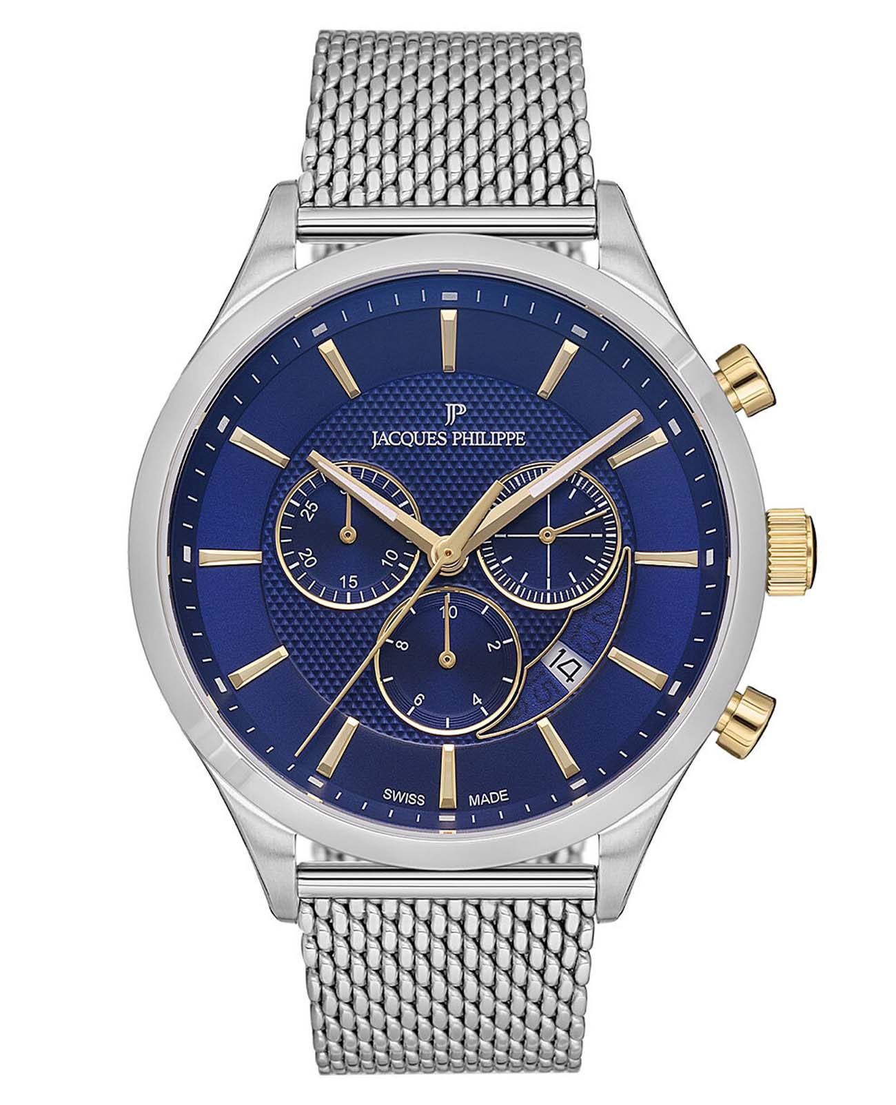 Швейцарские мужские часы-хронографХронографФункция позволяет измерять отрезки времени с особой точностью: часы, минуты, секунды. Верным признаком хронографа является наличие на циферблате 3 дополнительных окошек-счётчиков. Jacques Philippe Gallant JPQGC031236, кварцевый механизм с высокой точностью. Сапфировое стеклоСапфировое стеклоПрочный и надёжный материал из кристалла сапфира синтетического происхождения, характеризующийся особой твёрдостью и устойчивостью к царапинам и повреждениям. устойчивое к появлению царапин, обладающее высокой прозрачностью. Корпус часов изготовлен из нержавеющей стали. На циферблате три дополнительных индикатора. Стрелки с люминесцентным покрытиемЛюминесцентное покрытиеПозволяет считывать показания времени в темноте. Производители наносят на стрелки, часовые индексы, безель или поверхность циферблата светонакопительный состав, дающий холодное свечение.. Окошко даты находится между 4 и 5 часами. Класс водозащиты: 50 метров, позволит защитить корпус от случайных брызг или капель дождя. Стальной браслет миланского плетения на раскладном замкеРаскладной замокДанный вариант застежки используется только на часах с металлическим браслетом. Отличительная особенность такого крепления в том, что длина браслета становится универсальной и вы можете самостоятельно отрегулировать нужный вам размер – застежка просто двигается по браслету часов..