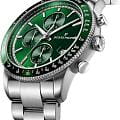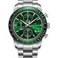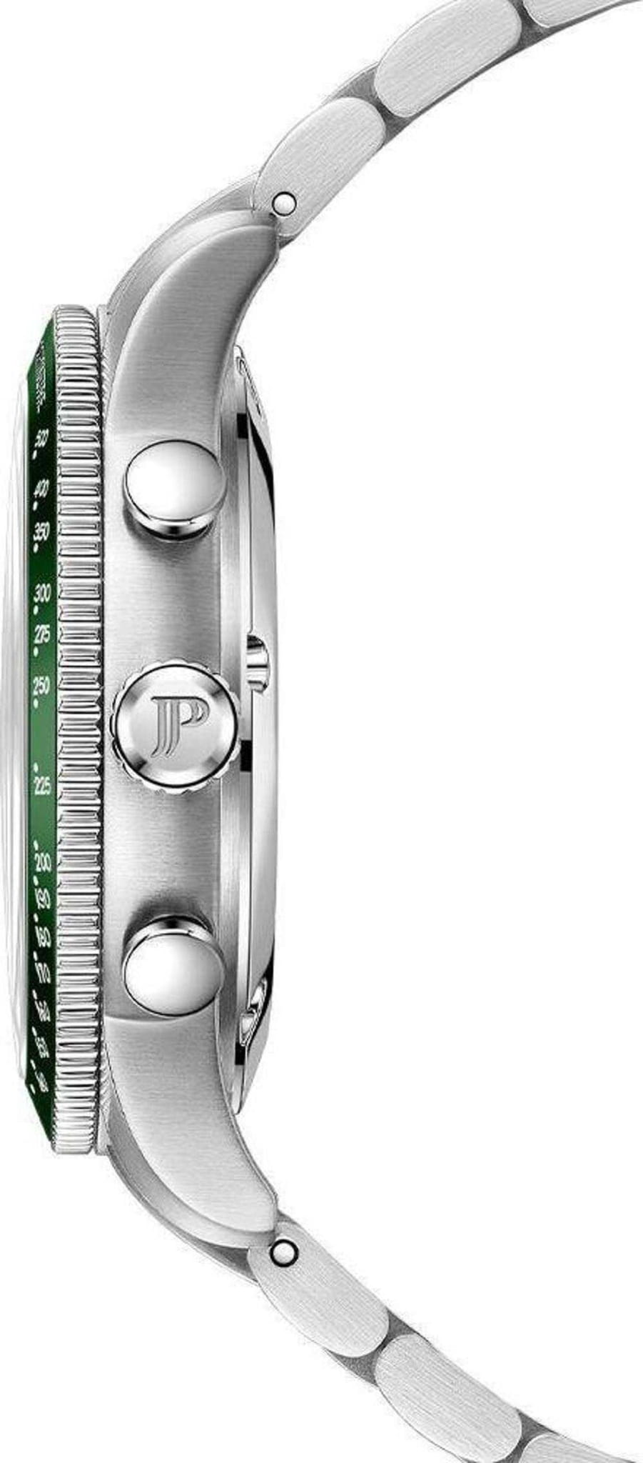 Швейцарские наручные часы Jacques Philippe JPQGC6913X6 сочетают в себе современный дизайн, надежность и функциональность, это стильные швейцарские часы с функцией хронографаХронографФункция позволяет измерять отрезки времени с особой точностью: часы, минуты, секунды. Верным признаком хронографа является наличие на циферблате 3 дополнительных окошек-счётчиков. и секундомераСекундомерСекундоме́р — прибор, способный измерять интервалы времени с точностью до долей секунды.. Корпус круглой формы диаметром 42 мм выполнен из прочной нержавеющей стали, а безельБезельВнешний ободок, закрепляющий стекло. В спортивных часах так называется поворотное кольцо с делениями на циферблате, выполняет роль таймера – замеряет отрезки времени на шкале. Неподвижный безель – элемент декора. Однонаправленно вращающийся безель на дайверских часах позволяет фиксировать моменты погружения и выныривания на поверхность. с элегантным зеленым IP-покрытиемIP-покрытиеМетод ионного напыления. Демонстрирует повышенную устойчивость к истиранию, окислению и химическим веществам. Под воздействием высокого давления и температуры около 1500°C молекулы металла надёжно соединяются с частицами корпуса часов.. Сапфировое стеклоСапфировое стеклоПрочный и надёжный материал из кристалла сапфира синтетического происхождения, характеризующийся особой твёрдостью и устойчивостью к царапинам и повреждениям. с антибликовым покрытиемАнтибликовое покрытиеСлой оксида металла в 0,13-0,3 микрон, благодаря которому стекло часов не бликует и не отражает свет. Антибликовое покрытие уменьшает отражение света в 10 раз, обеспечивая отличную читаемость показателей циферблата. надежно защищает зеленый циферблат от царапин и повреждений. Модель оснащена точным кварцевым механизмом, а также дополнительными функциями — тахиметромТахиметрРазмеченная шкала, располагается на ободке или безеле часов. Тахиметр позволяет рассчитать скорость на определённом участке пути, расстояние измеряется в километрах или милях. и индикатором даты, что делает часы не только стильным аксессуаром, но и практичным помощником на каждый день. Серебряный браслет шириной 22 мм удобно фиксируется на запястье с помощью застежки «бабочка»Застёжка "бабочка"Такой вид застёжки дополняется предохранителями, помогающими избежать случайного раскрытия браслета. Обладают изящным исполнением. . Стрелки имеют люминесцентное покрытиеЛюминесцентное покрытиеПозволяет считывать показания времени в темноте. Производители наносят на стрелки, часовые индексы, безель или поверхность циферблата светонакопительный состав, дающий холодное свечение. для удобства чтения времени в темноте. Водозащита 5 АТМ позволяет не снимать часы при дожде и случайных контактах с водой.