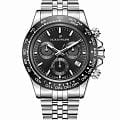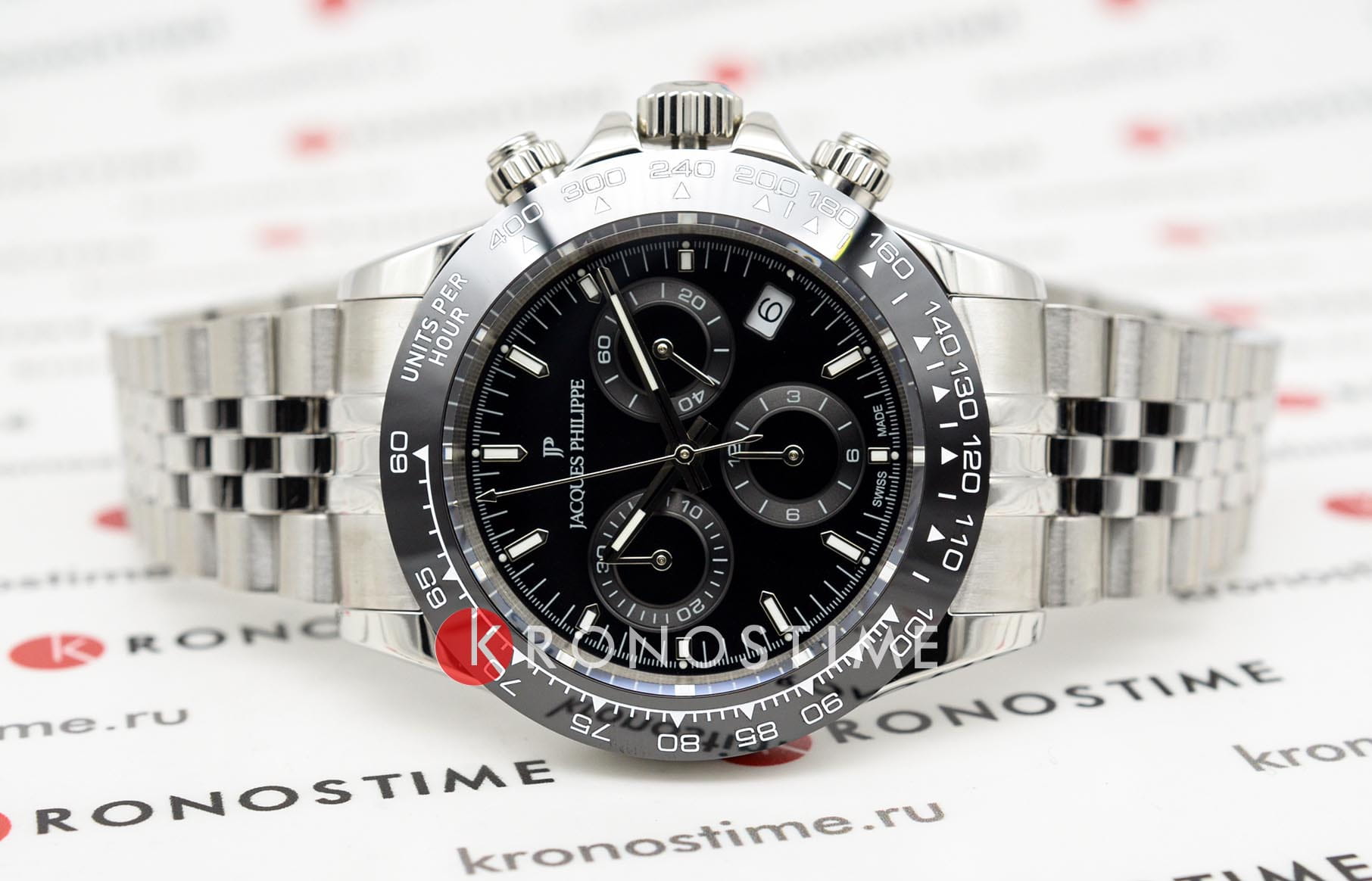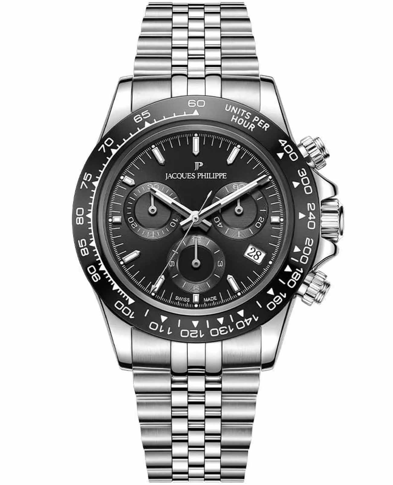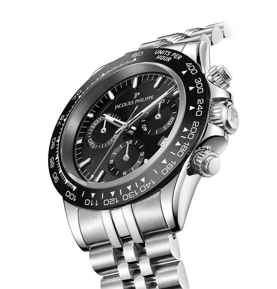 Швейцарские наручные часы Jacques Philippe JPQGC711316SBB сочетают в себе современный дизайн, надежность и функциональность, это стильные швейцарские часы с функцией хронографаХронографФункция позволяет измерять отрезки времени с особой точностью: часы, минуты, секунды. Верным признаком хронографа является наличие на циферблате 3 дополнительных окошек-счётчиков. и секундомераСекундомерСекундоме́р — прибор, способный измерять интервалы времени с точностью до долей секунды.. Корпус круглой формы диаметром 39 мм выполнен из прочной нержавеющей стали, а безельБезельВнешний ободок, закрепляющий стекло. В спортивных часах так называется поворотное кольцо с делениями на циферблате, выполняет роль таймера – замеряет отрезки времени на шкале. Неподвижный безель – элемент декора. Однонаправленно вращающийся безель на дайверских часах позволяет фиксировать моменты погружения и выныривания на поверхность. с элегантным черным IP-покрытиемIP-покрытиеМетод ионного напыления. Демонстрирует повышенную устойчивость к истиранию, окислению и химическим веществам. Под воздействием высокого давления и температуры около 1500°C молекулы металла надёжно соединяются с частицами корпуса часов., а сапфировое стеклоСапфировое стеклоПрочный и надёжный материал из кристалла сапфира синтетического происхождения, характеризующийся особой твёрдостью и устойчивостью к царапинам и повреждениям. надежно защищает черный циферблат от царапин и повреждений. Модель оснащена точным кварцевым механизмом RONDA 5030.D-4H, а также дополнительными функциями — тахиметромТахиметрРазмеченная шкала, располагается на ободке или безеле часов. Тахиметр позволяет рассчитать скорость на определённом участке пути, расстояние измеряется в километрах или милях. и индикатором даты, что делает часы не только стильным аксессуаром, но и практичным помощником на каждый день. Серебристый браслет шириной 20 мм удобно фиксируется на запястье с помощью застежки «бабочка»Застёжка "бабочка"Такой вид застёжки дополняется предохранителями, помогающими избежать случайного раскрытия браслета. Обладают изящным исполнением. . Стрелки имеют люминесцентное покрытиеЛюминесцентное покрытиеПозволяет считывать показания времени в темноте. Производители наносят на стрелки, часовые индексы, безель или поверхность циферблата светонакопительный состав, дающий холодное свечение. для удобства чтения времени в темноте. Водозащита 5 АТМ позволяет не снимать часы при дожде и случайных контактах с водой.