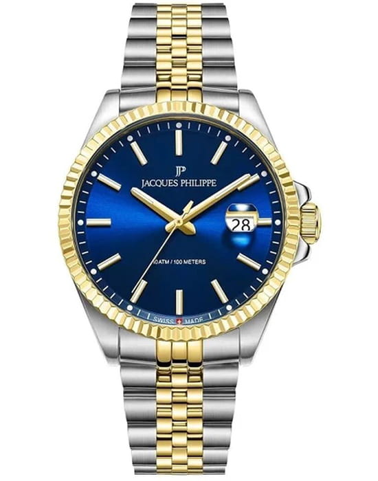 Jacques Philippe JPQGS597338V2 — мужские часы в сдержанном классическом исполнении с акцентом на простоту и надёжность. Корпус диаметром 40 мм выполнен из нержавеющей стали, а его умеренная толщина — около 12 мм — делает модель универсальной и комфортной в повседневной носке. БезельБезельВнешний ободок, закрепляющий стекло. В спортивных часах так называется поворотное кольцо с делениями на циферблате, выполняет роль таймера – замеряет отрезки времени на шкале. Неподвижный безель – элемент декора. Однонаправленно вращающийся безель на дайверских часах позволяет фиксировать моменты погружения и выныривания на поверхность. с PVD-покрытиемPVDУльтратонкое покрытие наносится в технике вакуумного напыления, сочетает в себе нитрид титана особой прочности со слоем золота или оксида хрома. Несёт в себе декоративную или защитную функцию.. Циферблат оформлен в светлом синем тоне с тонкими стрелками, лаконичными часовыми метками и аккуратным окошком даты в позиции «3 часа». Минималистичный стиль подчёркивает строгость и чистоту дизайна. Поверхность защищена устойчивым к царапинам сапфировым стекломСапфировое стеклоПрочный и надёжный материал из кристалла сапфира синтетического происхождения, характеризующийся особой твёрдостью и устойчивостью к царапинам и повреждениям., которое обеспечивает хорошую читаемость и долговечность. Механизм — точный швейцарский кварц, не требующий подзавода. Он обеспечивает стабильную и бесперебойную работу часов, сохраняя точность в любых условиях. Браслет из нержавеющей стали с PVD-покрытиемPVDУльтратонкое покрытие наносится в технике вакуумного напыления, сочетает в себе нитрид титана особой прочности со слоем золота или оксида хрома. Несёт в себе декоративную или защитную функцию. визуально продолжает корпус и фиксируется с помощью надёжной застёжки, обеспечивая комфортную посадку. Ширина браслета — 22 мм. Водозащита до 10 ATM позволяет использовать часы не только в повседневной жизни, но и при активности на воде. Jacques Philippe — это надёжная и универсальная модель для тех, кто ценит швейцарскую точность, простоту и уверенный стиль без лишних деталей.