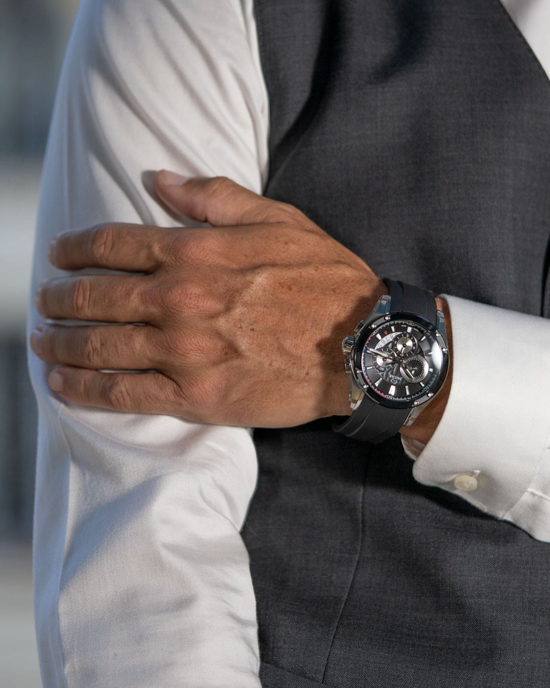 Мужские швейцарские часы-хронографХронографФункция позволяет измерять отрезки времени с особой точностью: часы, минуты, секунды. Верным признаком хронографа является наличие на циферблате 3 дополнительных окошек-счётчиков. Jaguar Special Edition J688/1. Кварцевый швейцарский калибр Ronda 5030.D. Сапфировое стеклоСапфировое стеклоПрочный и надёжный материал из кристалла сапфира синтетического происхождения, характеризующийся особой твёрдостью и устойчивостью к царапинам и повреждениям. устойчивое к мелким механическим повреждениям. Корпус часов изготовлен из нержавеющей стали. Стрелки и метки с люминесцентным покрытиемЛюминесцентное покрытиеПозволяет считывать показания времени в темноте. Производители наносят на стрелки, часовые индексы, безель или поверхность циферблата светонакопительный состав, дающий холодное свечение.. Окошко даты находится в положении между «3» и «6 часами». Класс водозащиты: 100 метров, позволит плавать, нырять и заниматься другими водными видами спорта. Силиконовый ремешок на стандартной застёжке. БезельБезельВнешний ободок, закрепляющий стекло. В спортивных часах так называется поворотное кольцо с делениями на циферблате, выполняет роль таймера – замеряет отрезки времени на шкале. Неподвижный безель – элемент декора. Однонаправленно вращающийся безель на дайверских часах позволяет фиксировать моменты погружения и выныривания на поверхность. с PVD-покрытиемPVDУльтратонкое покрытие наносится в технике вакуумного напыления, сочетает в себе нитрид титана особой прочности со слоем золота или оксида хрома. Несёт в себе декоративную или защитную функцию..