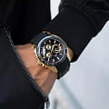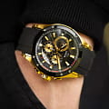 Мужские швейцарские часы-хронографХронографФункция позволяет измерять отрезки времени с особой точностью: часы, минуты, секунды. Верным признаком хронографа является наличие на циферблате 3 дополнительных окошек-счётчиков. Jaguar Special Edition J691/2. Кварцевый швейцарский калибр Ronda 5030.D. Сапфировое стеклоСапфировое стеклоПрочный и надёжный материал из кристалла сапфира синтетического происхождения, характеризующийся особой твёрдостью и устойчивостью к царапинам и повреждениям. устойчивое к мелким механическим повреждениям. Корпус часов изготовлен из нержавеющей стали с PVD-покрытиемPVDУльтратонкое покрытие наносится в технике вакуумного напыления, сочетает в себе нитрид титана особой прочности со слоем золота или оксида хрома. Несёт в себе декоративную или защитную функцию.. Стрелки и метки с люминесцентным покрытиемЛюминесцентное покрытиеПозволяет считывать показания времени в темноте. Производители наносят на стрелки, часовые индексы, безель или поверхность циферблата светонакопительный состав, дающий холодное свечение.. Окошко даты находится в положении между «3» и «6 часами». Класс водозащиты: 100 метров, позволит плавать, нырять и заниматься другими водными видами спорта. Силиконовый ремешок на стандартной застёжке. БезельБезельВнешний ободок, закрепляющий стекло. В спортивных часах так называется поворотное кольцо с делениями на циферблате, выполняет роль таймера – замеряет отрезки времени на шкале. Неподвижный безель – элемент декора. Однонаправленно вращающийся безель на дайверских часах позволяет фиксировать моменты погружения и выныривания на поверхность. с PVD-покрытиемPVDУльтратонкое покрытие наносится в технике вакуумного напыления, сочетает в себе нитрид титана особой прочности со слоем золота или оксида хрома. Несёт в себе декоративную или защитную функцию..