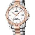 Женские швейцарские часы Jaguar Couple Diver J871/1. Кварцевый швейцарский калибр Ronda 705. Сапфировое стеклоСапфировое стеклоПрочный и надёжный материал из кристалла сапфира синтетического происхождения, характеризующийся особой твёрдостью и устойчивостью к царапинам и повреждениям. устойчивое к мелким механическим повреждениям. Корпус часов изготовлен из нержавеющей стали. Стрелки и метки с люминесцентным покрытиемЛюминесцентное покрытиеПозволяет считывать показания времени в темноте. Производители наносят на стрелки, часовые индексы, безель или поверхность циферблата светонакопительный состав, дающий холодное свечение.. Окошко даты находится в положении 3 часа. Класс водозащиты: 200 метров, позволит плавать, нырять и заниматься другими водными видами спорта. Стальной браслет с частичным PVD-покрытиемPVDУльтратонкое покрытие наносится в технике вакуумного напыления, сочетает в себе нитрид титана особой прочности со слоем золота или оксида хрома. Несёт в себе декоративную или защитную функцию. на раскладной застёжкеРаскладная застёжкаТакой тип застёжки используется только на браслетах из металла. Она никогда не раскрывается полностью, происходит разделение на 2 и более частей. Раскладывающая застёжка снизит вероятность потери часов к минимуму.. Циферблат украшен кристаллом. БезельБезельВнешний ободок, закрепляющий стекло. В спортивных часах так называется поворотное кольцо с делениями на циферблате, выполняет роль таймера – замеряет отрезки времени на шкале. Неподвижный безель – элемент декора. Однонаправленно вращающийся безель на дайверских часах позволяет фиксировать моменты погружения и выныривания на поверхность. с PVD-покрытиемPVDУльтратонкое покрытие наносится в технике вакуумного напыления, сочетает в себе нитрид титана особой прочности со слоем золота или оксида хрома. Несёт в себе декоративную или защитную функцию..