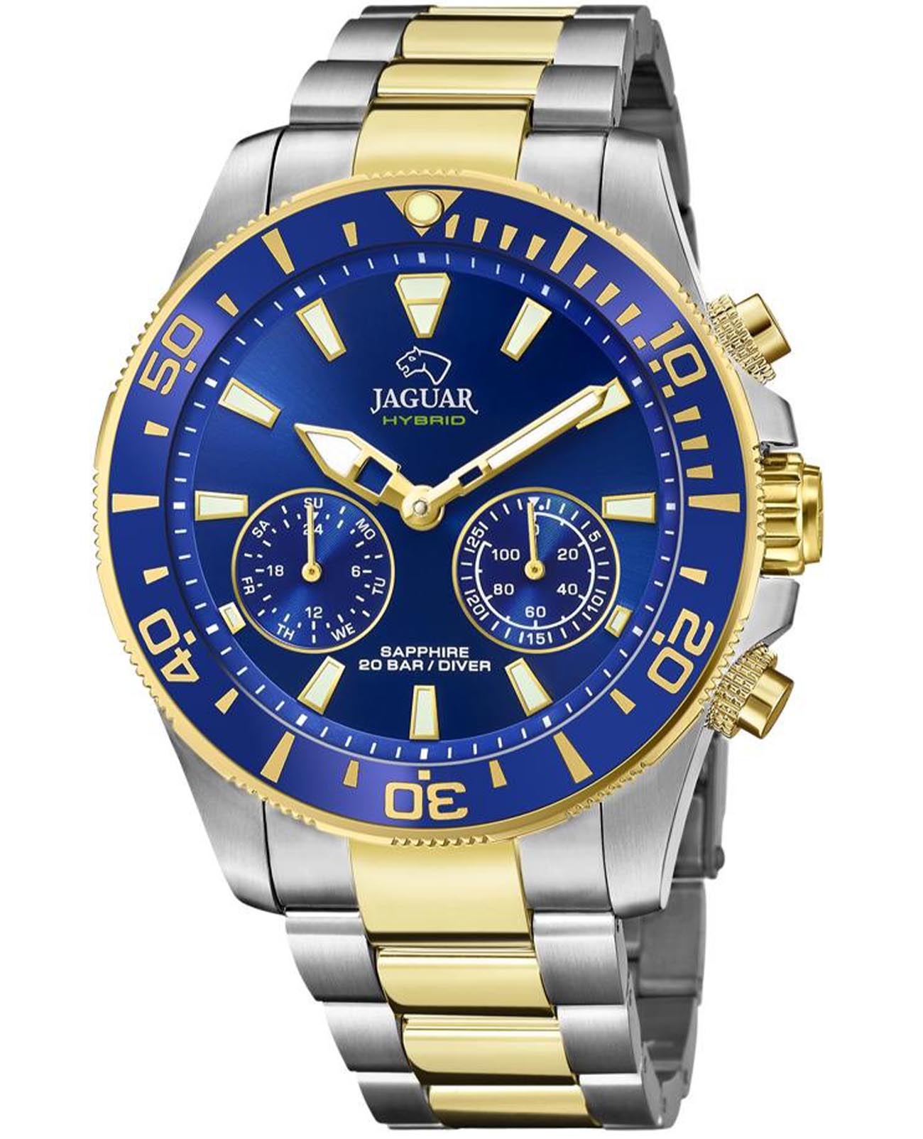 Мужские швейцарские часы Jaguar Connected J889/1. Сапфировое стеклоСапфировое стеклоПрочный и надёжный материал из кристалла сапфира синтетического происхождения, характеризующийся особой твёрдостью и устойчивостью к царапинам и повреждениям. устойчивое к мелким механическим повреждениям. Корпус часов изготовлен из нержавеющей стали. Стрелки и метки с люминесцентным покрытиемЛюминесцентное покрытиеПозволяет считывать показания времени в темноте. Производители наносят на стрелки, часовые индексы, безель или поверхность циферблата светонакопительный состав, дающий холодное свечение.. Календарь находится в положении 8 часов. Класс водозащиты: 200 метров, позволит плавать, нырять и заниматься другими водными видами спорта. Стальной браслет с частичным  PVD-покрытиемPVDУльтратонкое покрытие наносится в технике вакуумного напыления, сочетает в себе нитрид титана особой прочности со слоем золота или оксида хрома. Несёт в себе декоративную или защитную функцию. на раскладной застёжкеРаскладная застёжкаТакой тип застёжки используется только на браслетах из металла. Она никогда не раскрывается полностью, происходит разделение на 2 и более частей. Раскладывающая застёжка снизит вероятность потери часов к минимуму.. БезельБезельВнешний ободок, закрепляющий стекло. В спортивных часах так называется поворотное кольцо с делениями на циферблате, выполняет роль таймера – замеряет отрезки времени на шкале. Неподвижный безель – элемент декора. Однонаправленно вращающийся безель на дайверских часах позволяет фиксировать моменты погружения и выныривания на поверхность. с PVD-покрытиемPVDУльтратонкое покрытие наносится в технике вакуумного напыления, сочетает в себе нитрид титана особой прочности со слоем золота или оксида хрома. Несёт в себе декоративную или защитную функцию.. За точный ход работы часов, из коллекции Connected, отвечает кварцевый гибридный механизм швейцарского производства со Смарт-Модулем. Данный тип механизма обеспечивает возможность подключить часы к телефону через Bluetooth и управлять большим рядом дополнительных функций на выбор с помошью приложения Jaguar. Дополнительные функции: отображение даты и дня недели, секундомер, таймер, GMT, шагомер, поиск телефона, включение/выключение звука телефона при входящих вызовах, переключение музыки, вибро-уведомления.