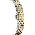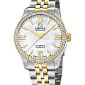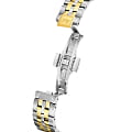 Женские швейцарские часы Jaguar Automatic Woman J998/1, механизм — автоподзавод. В часах с автоподзаводом заводная головка практически не используется, что исключает истирание ее материала и материала корпуса. Сапфировое стеклоСапфировое стеклоПрочный и надёжный материал из кристалла сапфира синтетического происхождения, характеризующийся особой твёрдостью и устойчивостью к царапинам и повреждениям. устойчивое к мелким механическим повреждениям. Корпус и браслет часов изготовлены из нержавеющей стали. Окошко даты находится в положении 6 часов. Класс водозащиты: 50 метров, позволит защитить корпус от случайных брызг или капель дождя. Стальной браслет с частичным  PVD-покрытиемPVDУльтратонкое покрытие наносится в технике вакуумного напыления, сочетает в себе нитрид титана особой прочности со слоем золота или оксида хрома. Несёт в себе декоративную или защитную функцию. на застёжке-бабочке с кнопкамиЗастёжка "бабочка"Такой вид застёжки дополняется предохранителями, помогающими избежать случайного раскрытия браслета. Обладают изящным исполнением. . БезельБезельВнешний ободок, закрепляющий стекло. В спортивных часах так называется поворотное кольцо с делениями на циферблате, выполняет роль таймера – замеряет отрезки времени на шкале. Неподвижный безель – элемент декора. Однонаправленно вращающийся безель на дайверских часах позволяет фиксировать моменты погружения и выныривания на поверхность. с PVD-покрытиемPVDУльтратонкое покрытие наносится в технике вакуумного напыления, сочетает в себе нитрид титана особой прочности со слоем золота или оксида хрома. Несёт в себе декоративную или защитную функцию. инкрустирован цирконием.