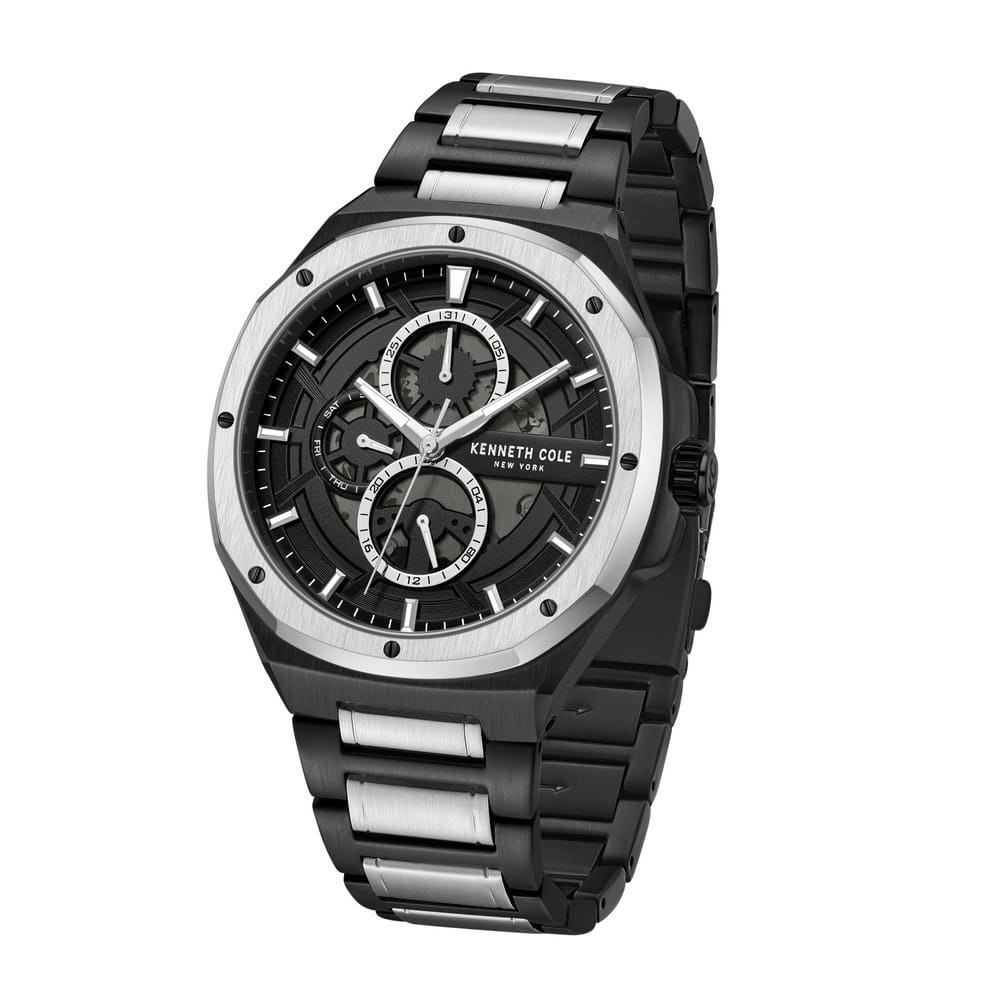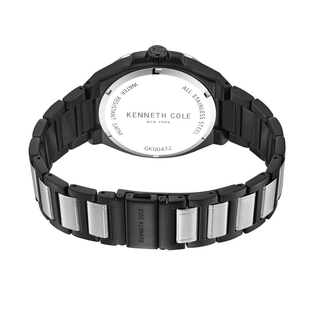 Мужские кварцевые часы Kenneth Cole KCWGK0047203 из коллекции Dress Sport — это стильный и функциональный аксессуар с современным дизайном. Корпус размером 43 мм выполнен из нержавеющей стали 316L с IP-покрытиемIP-покрытиеМетод ионного напыления. Демонстрирует повышенную устойчивость к истиранию, окислению и химическим веществам. Под воздействием высокого давления и температуры около 1500°C молекулы металла надёжно соединяются с частицами корпуса часов.. Циферблат чёрного цвета оформлен метками в виде штрихов и дополнен функцией индикацией даты и 12/24-часовым форматом времени. Стрелки и метки оснащены люминесцентным покрытиемЛюминесцентное покрытиеПозволяет считывать показания времени в темноте. Производители наносят на стрелки, часовые индексы, безель или поверхность циферблата светонакопительный состав, дающий холодное свечение., обеспечивающим хорошую читаемость в темноте. Циферблат защищён минеральным стекломМинеральное стеклоМинеральное стекло представляет собой искусственно выращенный минерал кварца. Такое стекло отличается особой устойчивостью к повреждениям и царапинам. Уступает по некоторым качествам сапфировому стеклу.. Часы оснащены Браслетом из нержавеющей стали с IP-покрытиемIP-покрытиеМетод ионного напыления. Демонстрирует повышенную устойчивость к истиранию, окислению и химическим веществам. Под воздействием высокого давления и температуры около 1500°C молекулы металла надёжно соединяются с частицами корпуса часов. на раскладной застёжкеРаскладная застёжкаТакой тип застёжки используется только на браслетах из металла. Она никогда не раскрывается полностью, происходит разделение на 2 и более частей. Раскладывающая застёжка снизит вероятность потери часов к минимуму.. Водонепроницаемость 50 м позволяет использовать часы для повседневного ношения. Надёжный выбор для тех, кто ценит современный стиль и практичность.